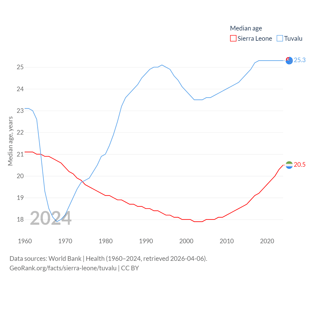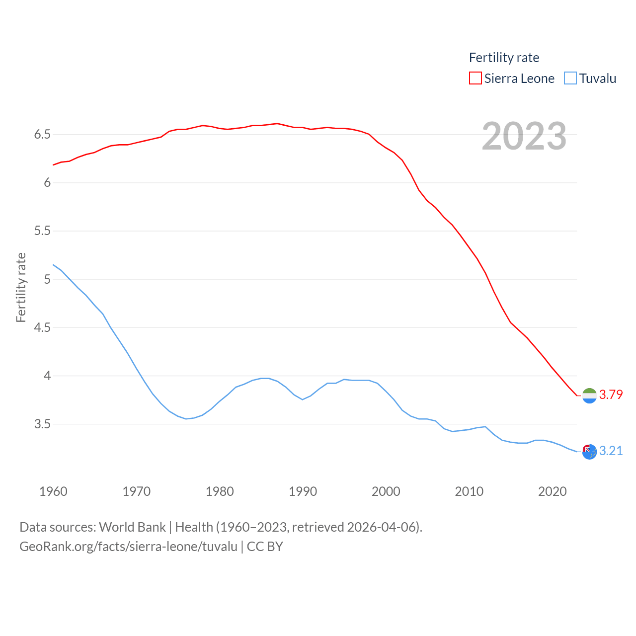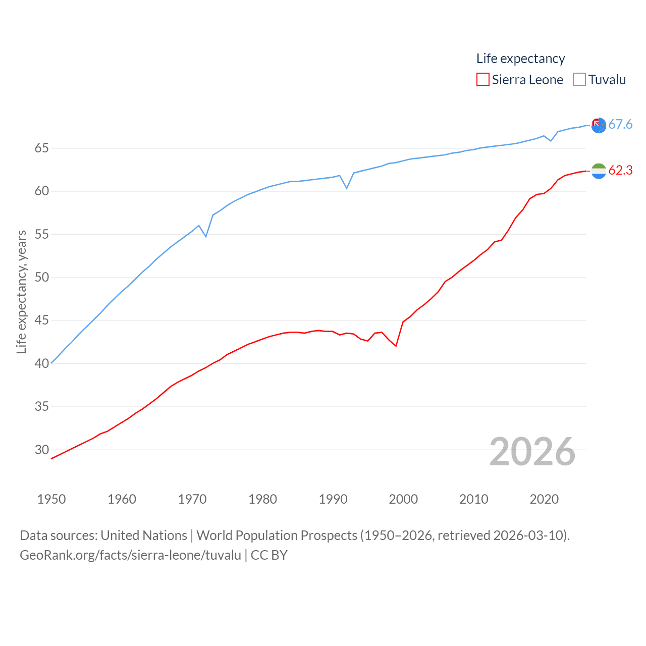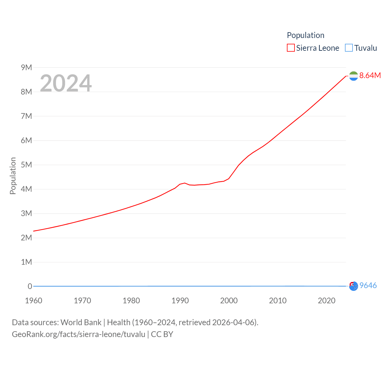 Sierra Leone has a population of 8.64M (ranked 102/197), compared with 9.65K in Tuvalu (ranked 196/197). Sierra Leone's land area is 27,869 sq mi versus 11.6 sq mi for Tuvalu (ranked 116th vs. 194th).