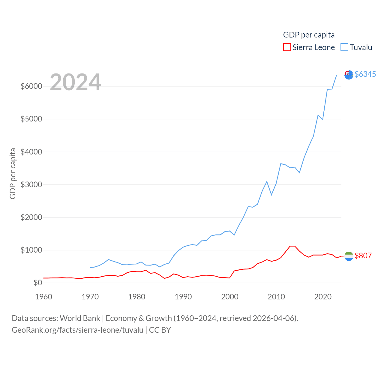 By GDP, Sierra Leone ranks 160/197 ($6.97B) and Tuvalu ranks 196/197 ($62.3M). By GDP per capita, Sierra Leone ranks 186/197 ($807), while Tuvalu ranks 110/197 ($6,345).
