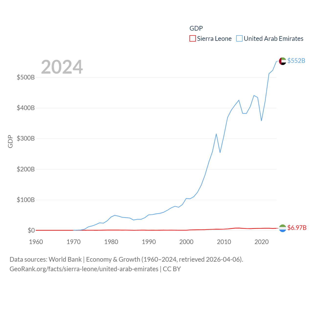 By GDP, Sierra Leone ranks 160/197 ($6.97B) and The United Arab Emirates ranks 27/197 ($552B). By GDP per capita, Sierra Leone ranks 186/197 ($807), while The United Arab Emirates ranks 24/197 ($50,274).