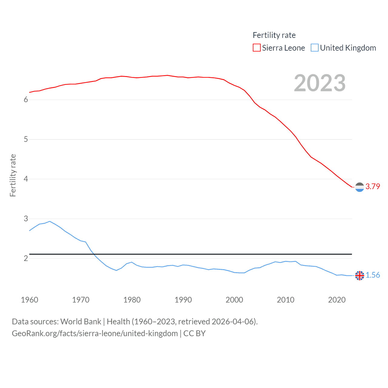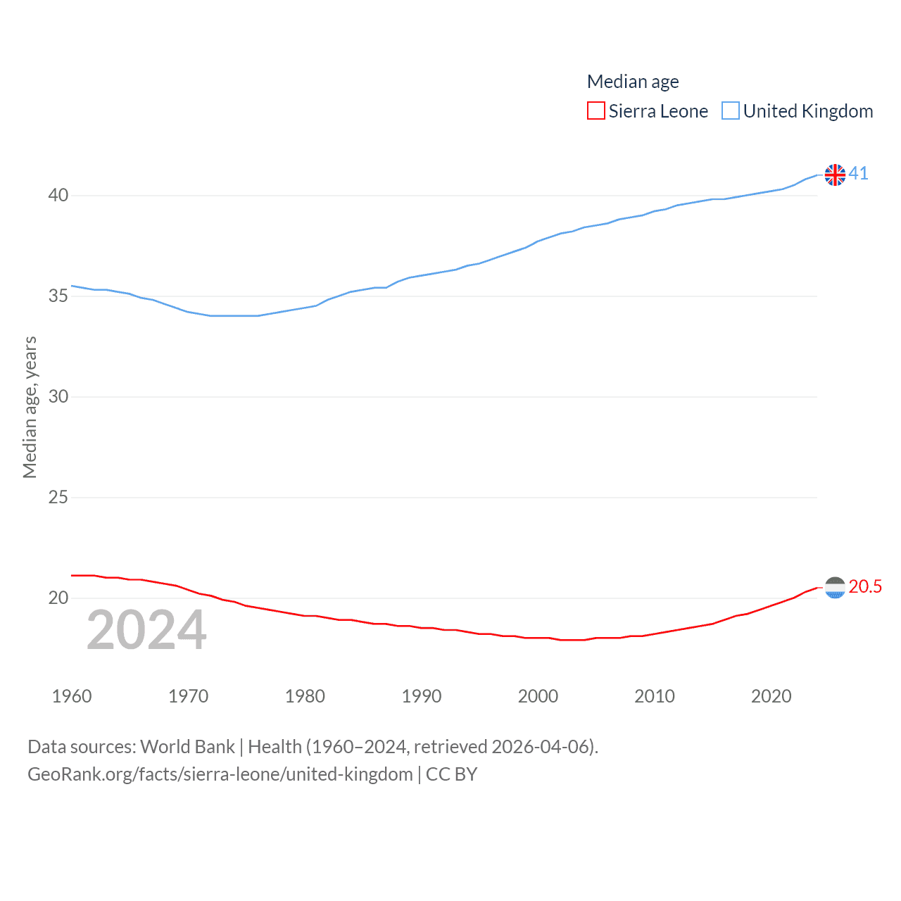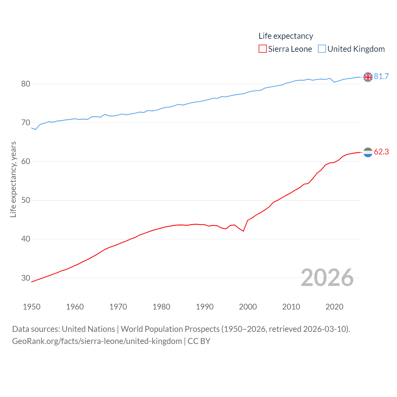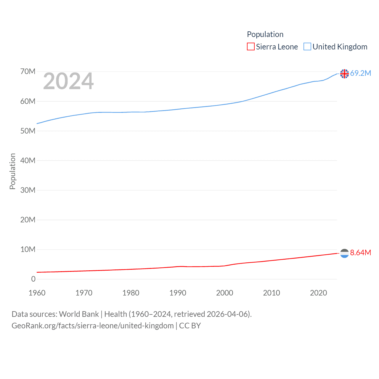 Sierra Leone has a population of 8.64M (ranked 102/197), compared with 69.2M in The United Kingdom (ranked 21/197). Sierra Leone's land area is 27,869 sq mi versus 93,410 sq mi for The United Kingdom (ranked 116th vs. 78th).