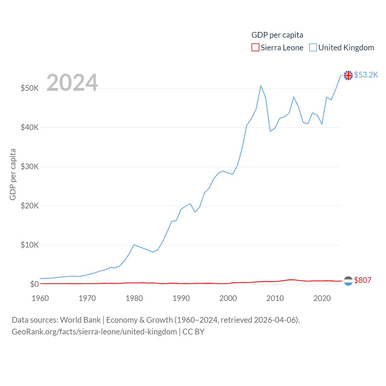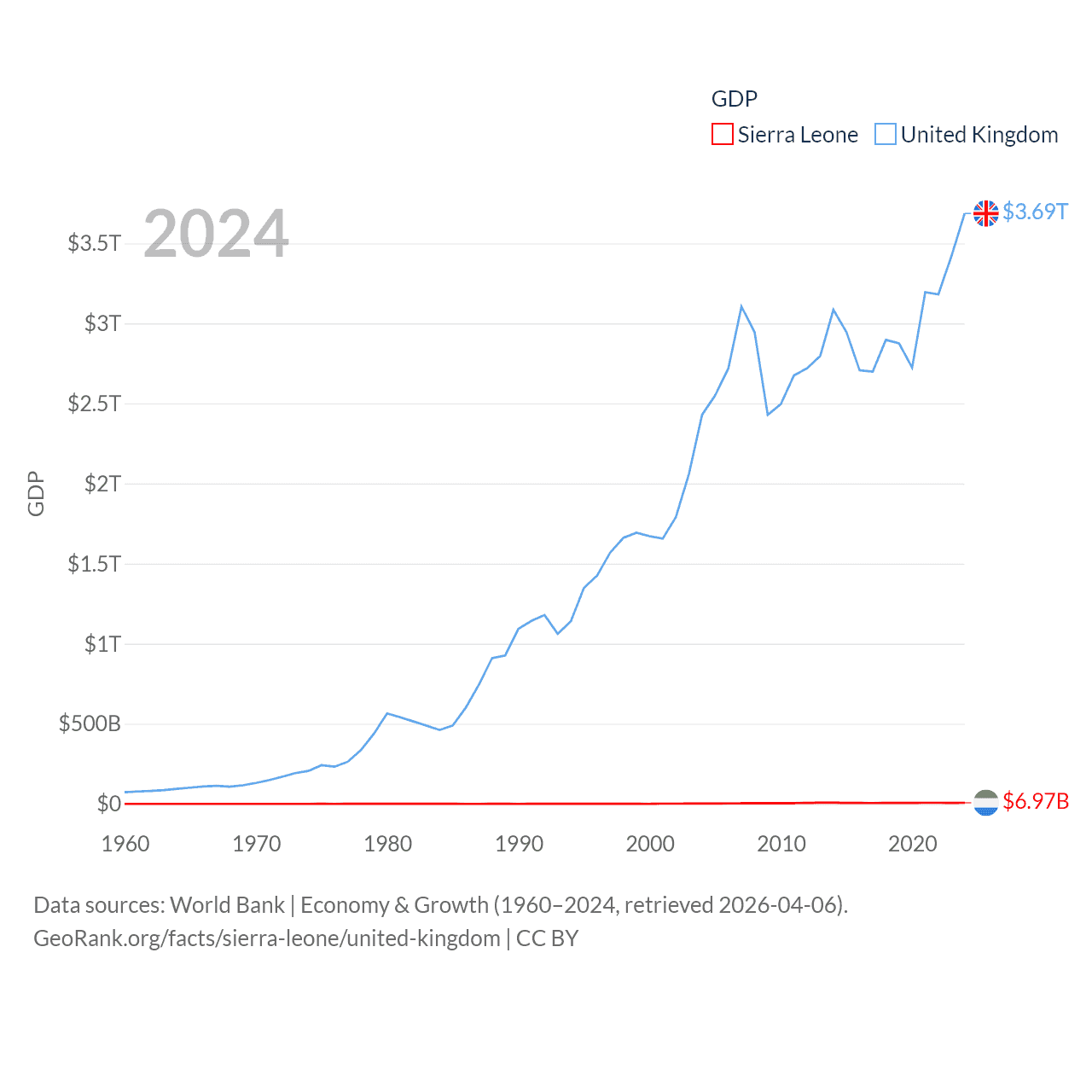 By GDP, Sierra Leone ranks 160/197 ($6.97B) and The United Kingdom ranks 6/197 ($3.69T). By GDP per capita, Sierra Leone ranks 186/197 ($807), while The United Kingdom ranks 22/197 ($53,246).