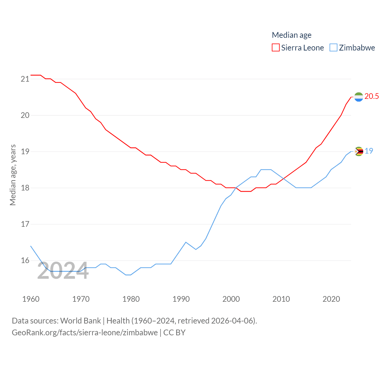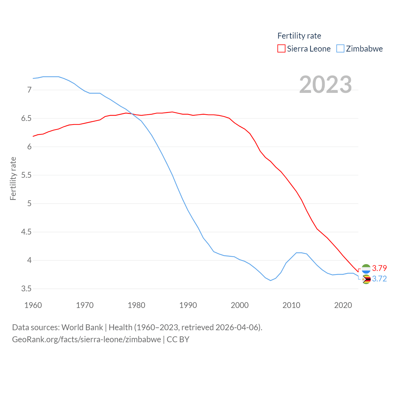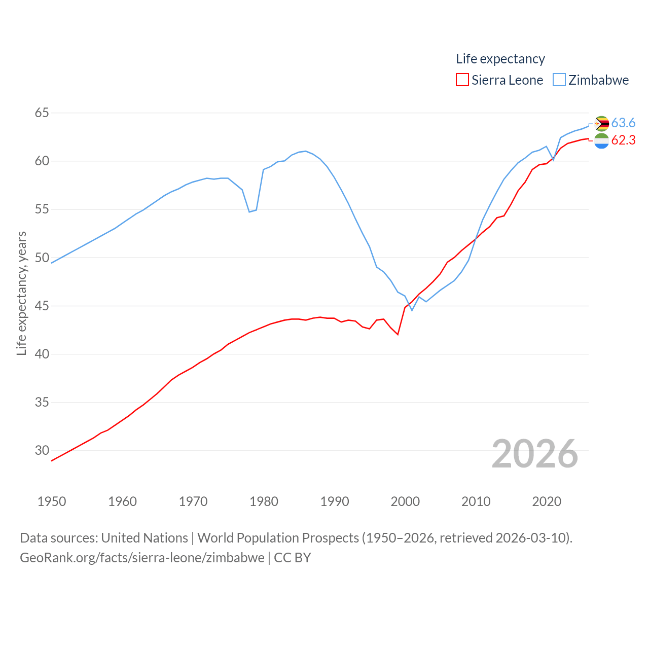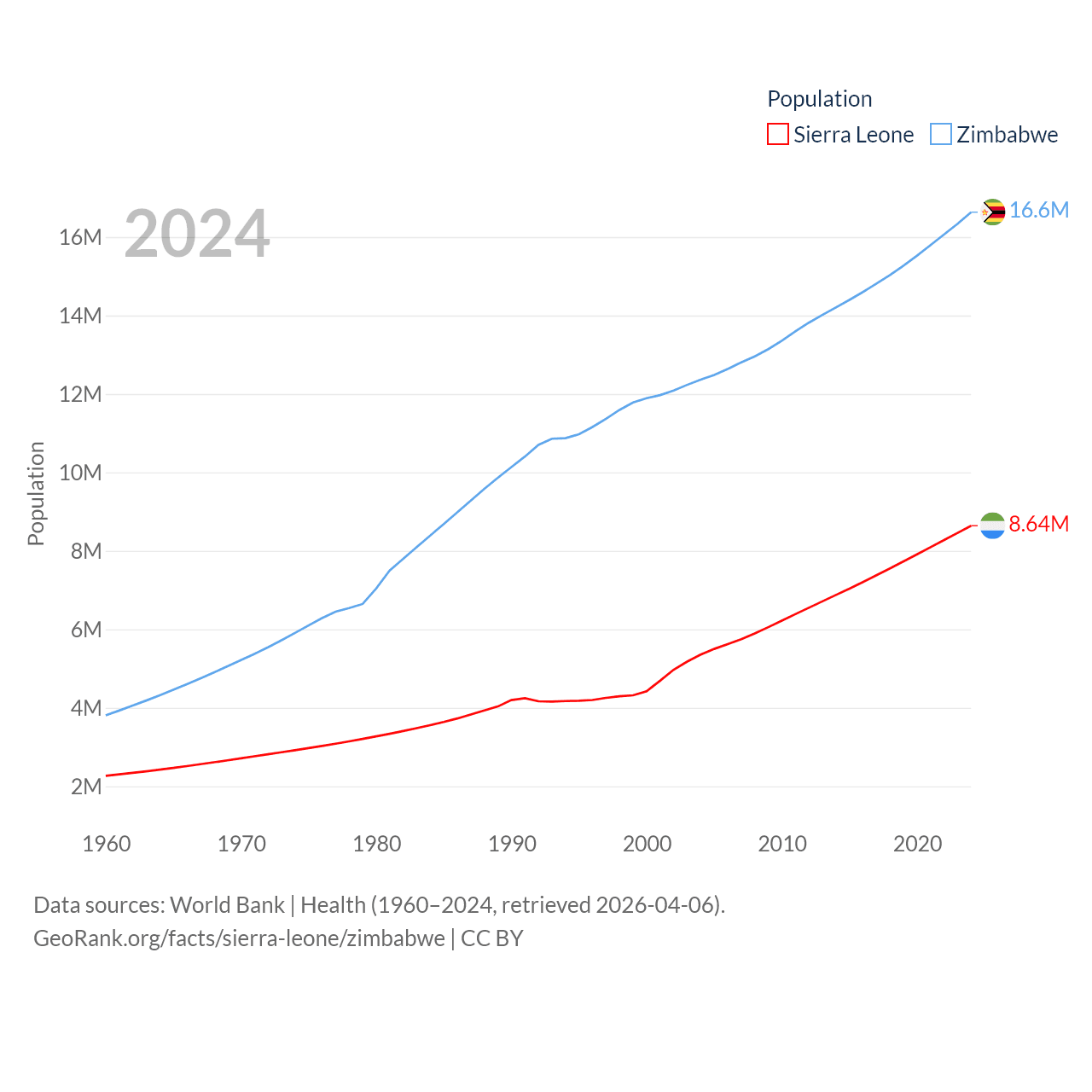 Sierra Leone has a population of 8.64M (ranked 102/197), compared with 16.6M in Zimbabwe (ranked 74/197). Sierra Leone's land area is 27,869 sq mi versus 149,364 sq mi for Zimbabwe (ranked 116th vs. 60th).