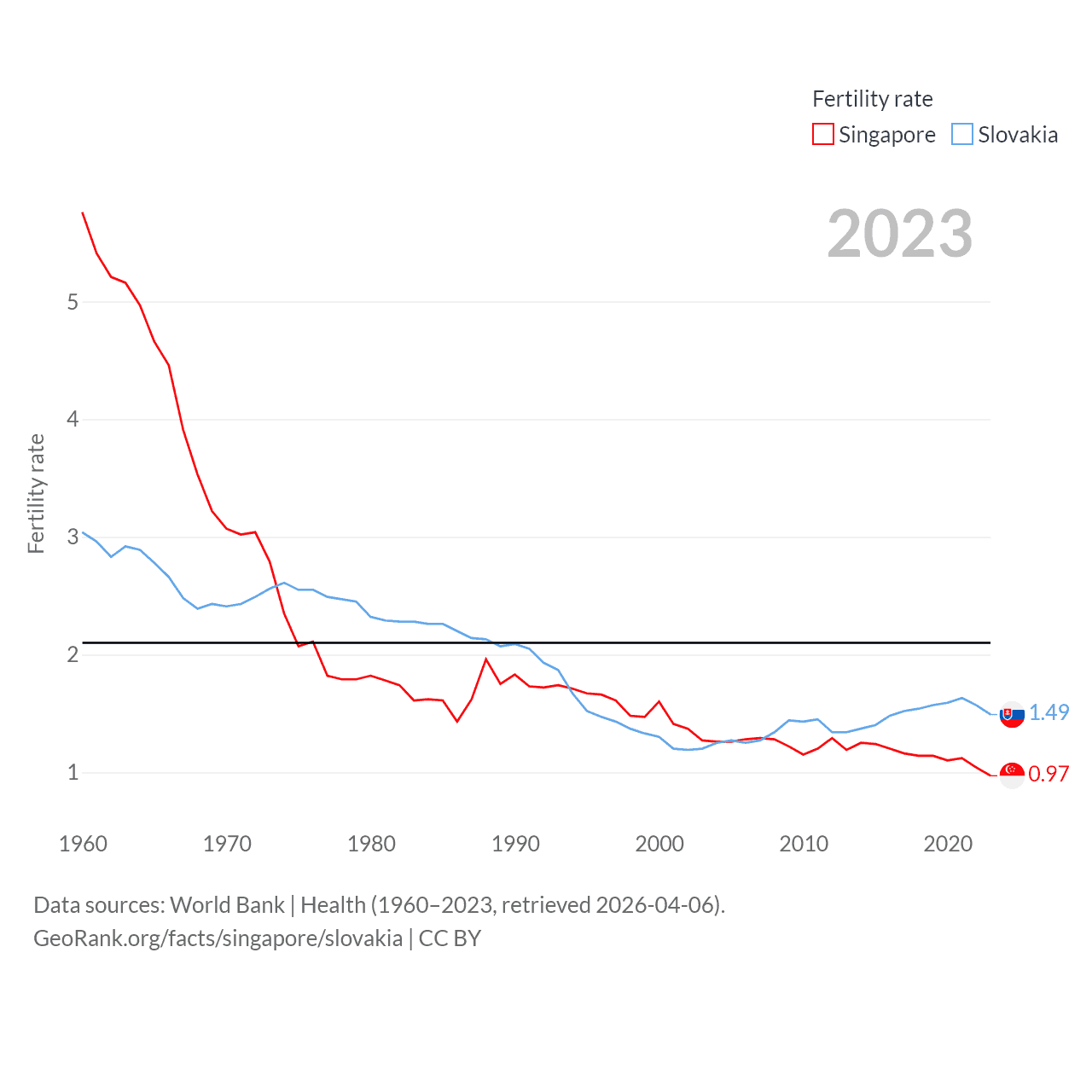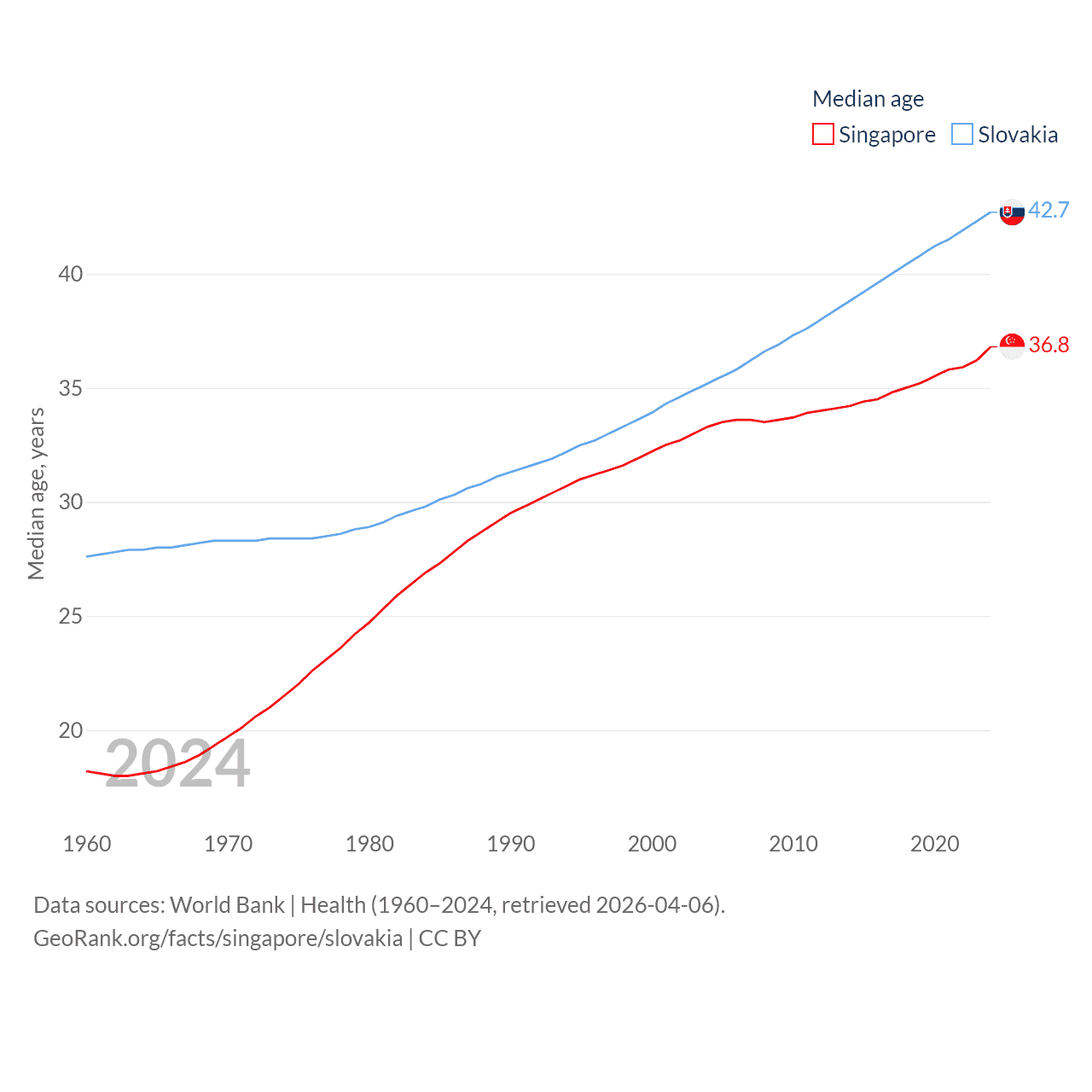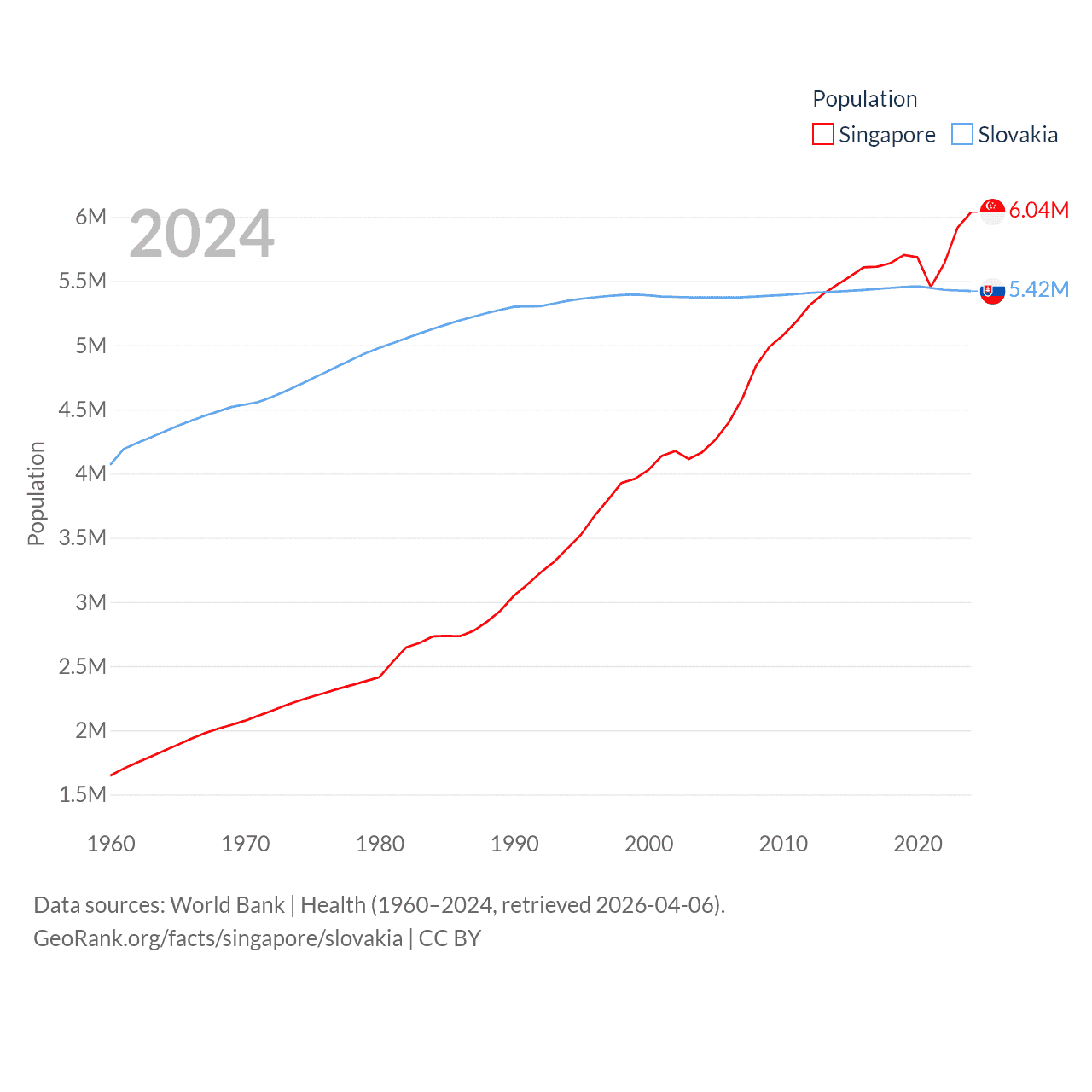 Singapore has a population of 6.04M (ranked 113/197), compared with 5.42M in Slovakia (ranked 119/197). Singapore's land area is 277.2 sq mi versus 18,564 sq mi for Slovakia (ranked 177th vs. 128th).