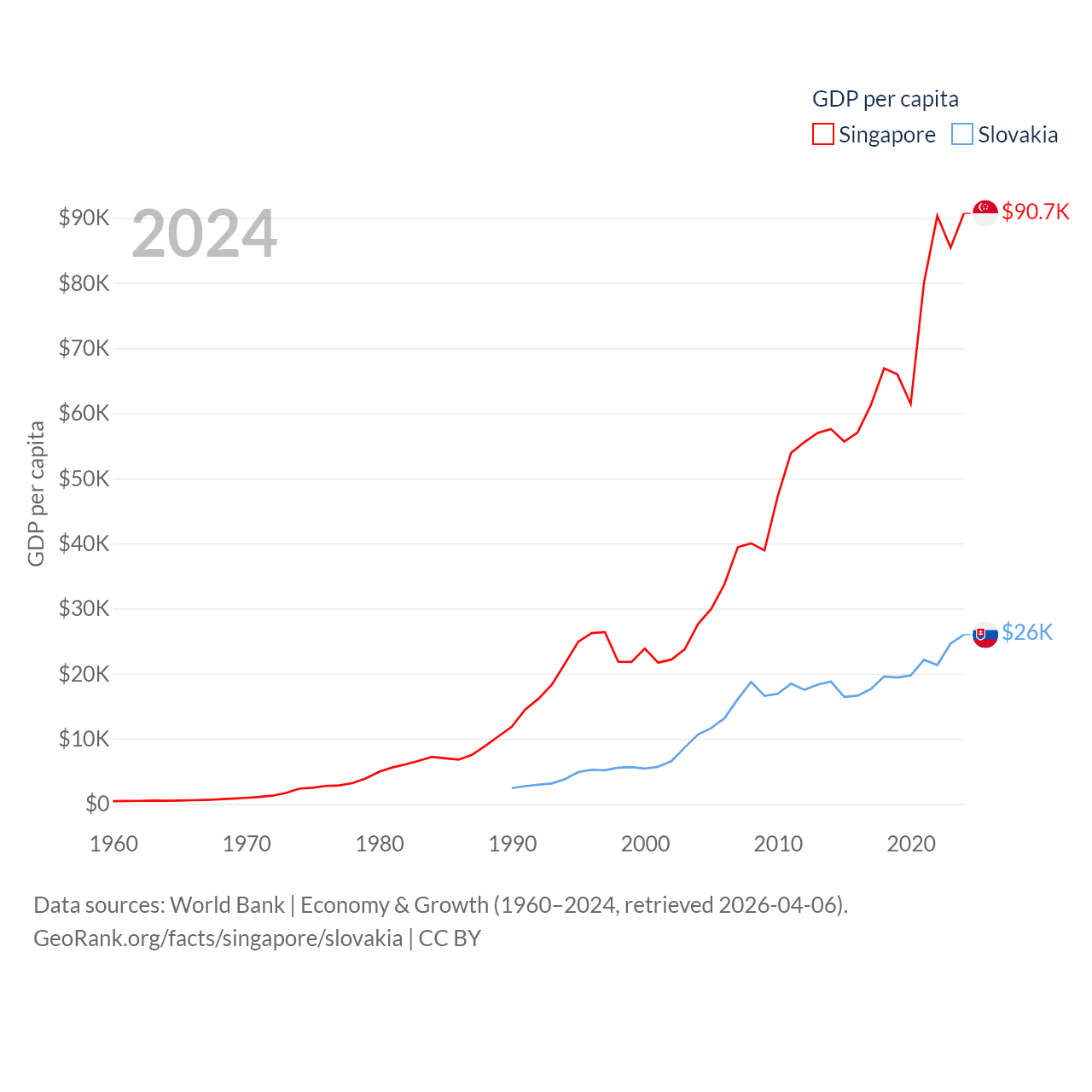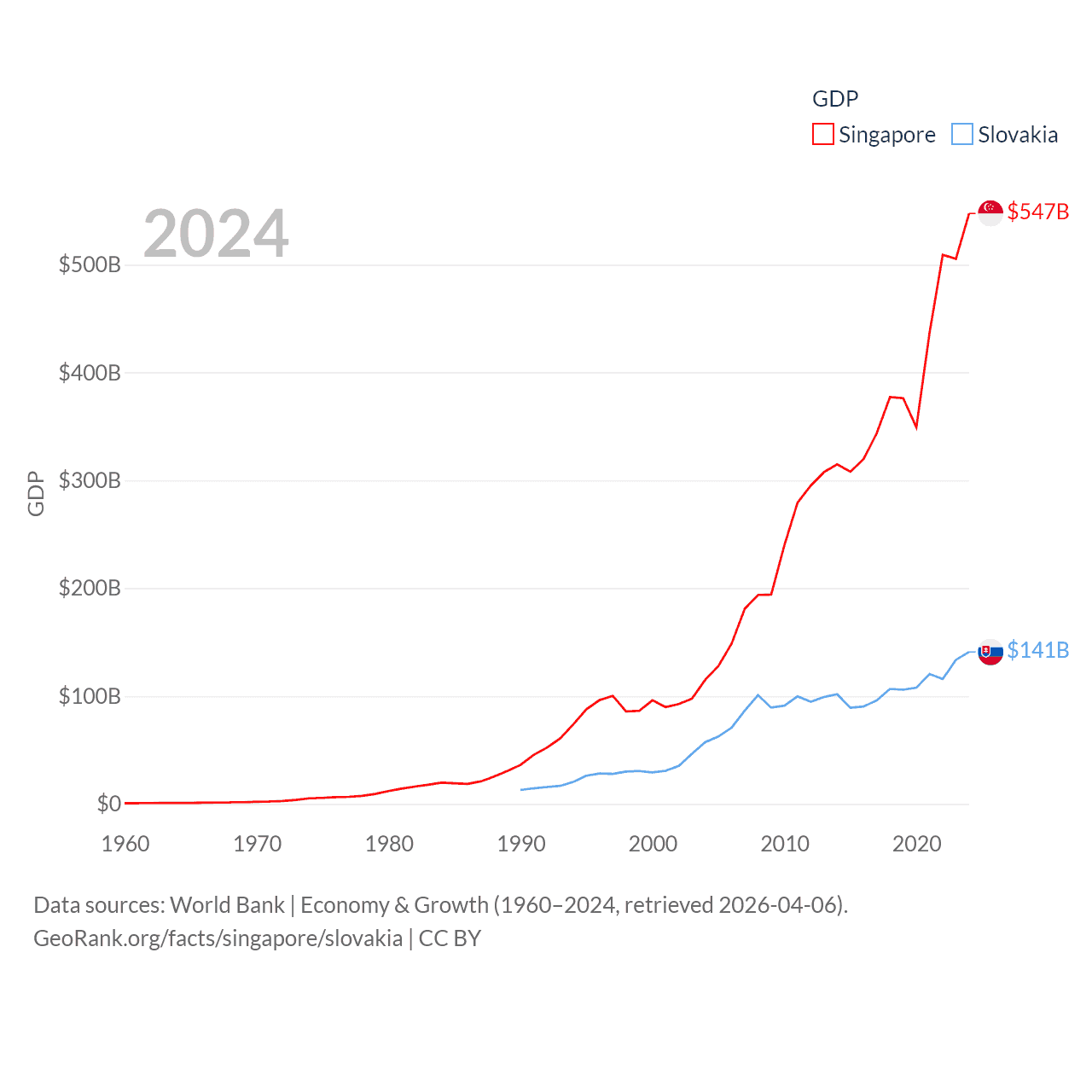 By GDP, Singapore ranks 28/197 ($547B) and Slovakia ranks 61/197 ($141B). By GDP per capita, Singapore ranks 7/197 ($90,674), while Slovakia ranks 47/197 ($25,993).