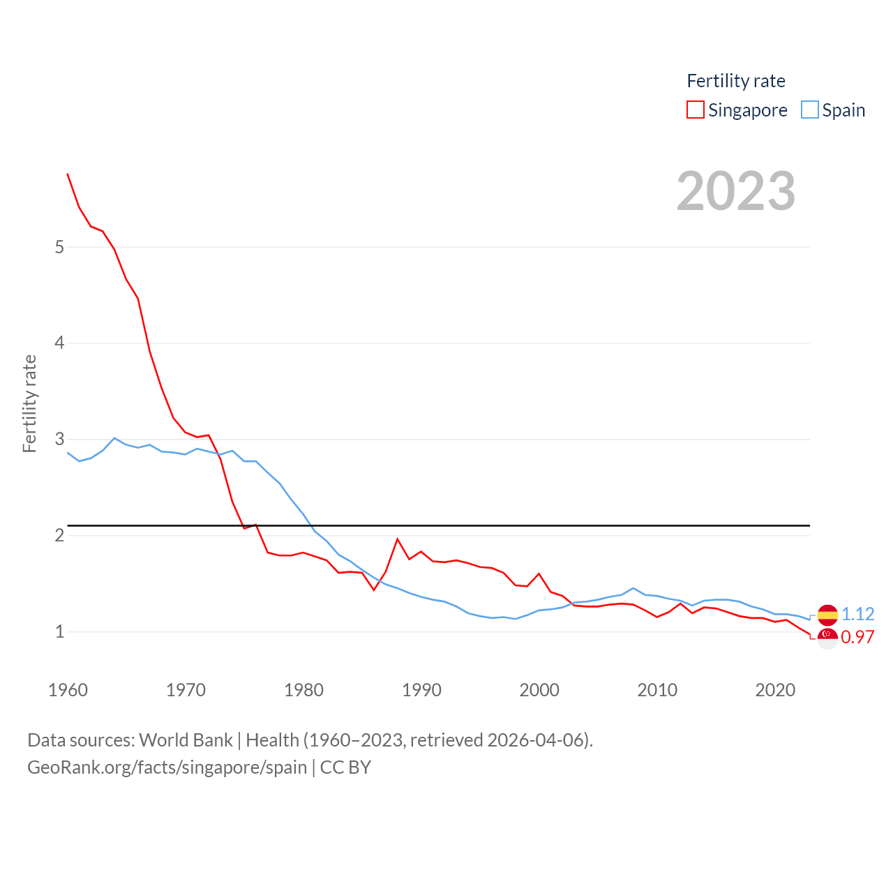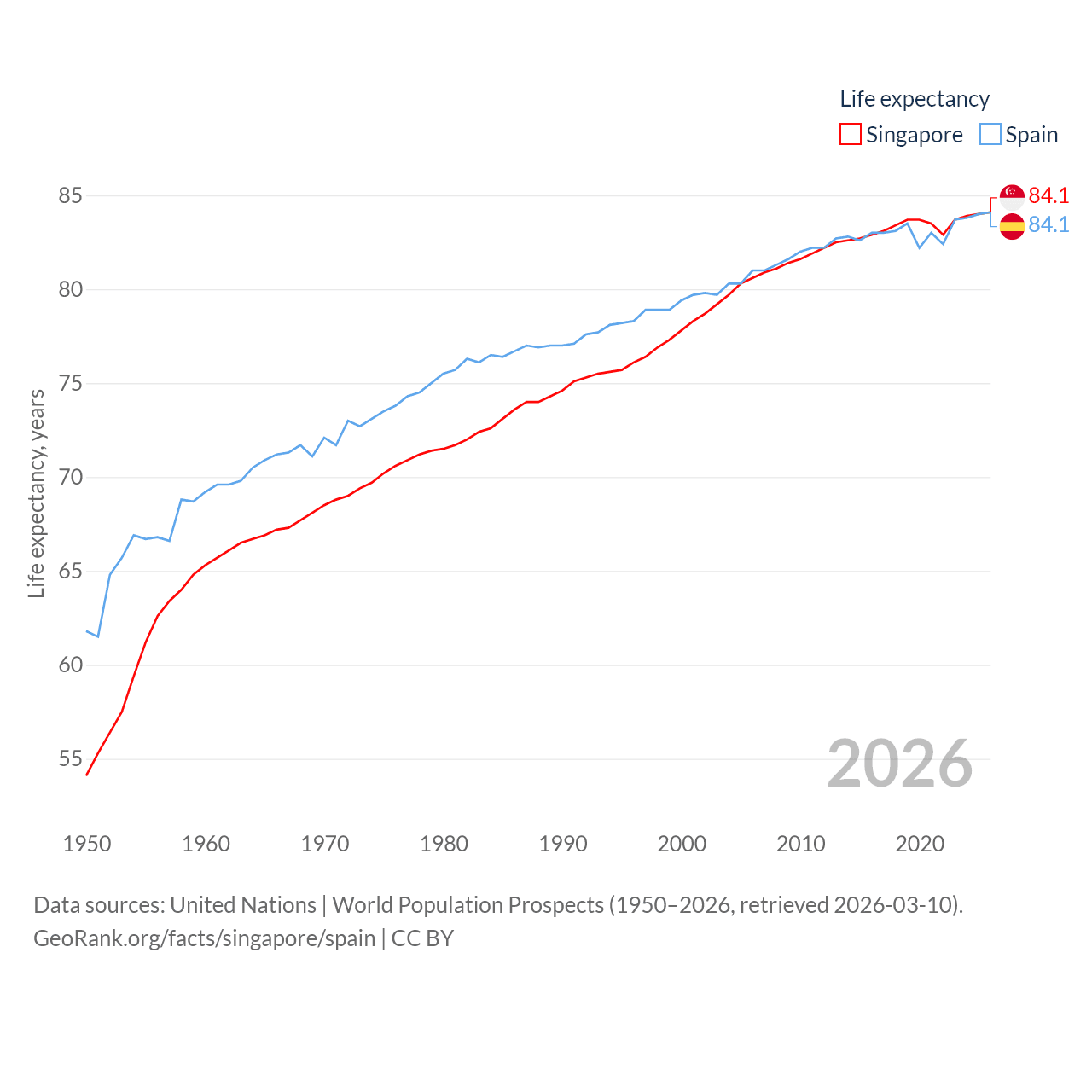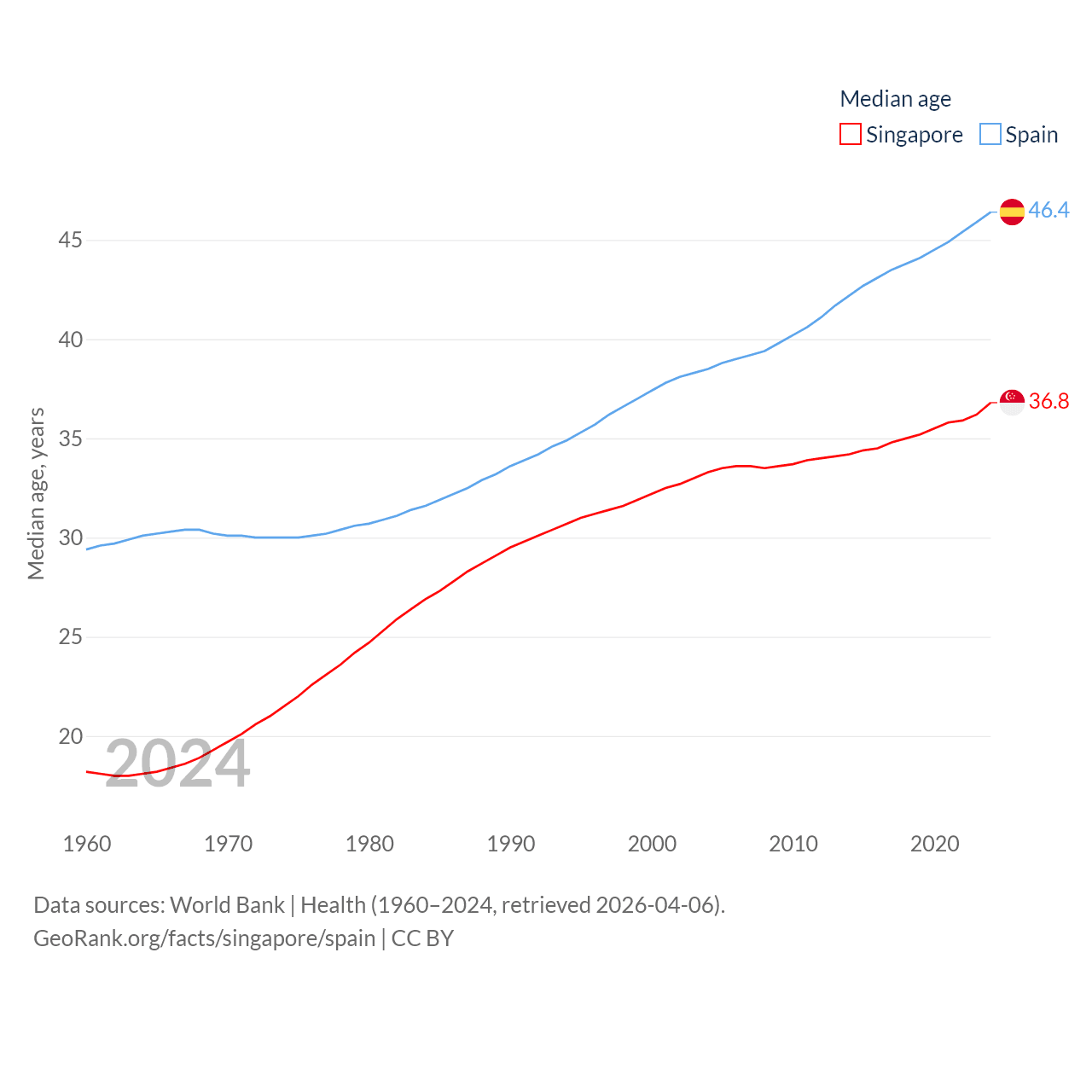 Singapore has a population of 6.04M (ranked 113/197), compared with 48.8M in Spain (ranked 32/197). Singapore's land area is 277.2 sq mi versus 192,934 sq mi for Spain (ranked 177th vs. 51st).
