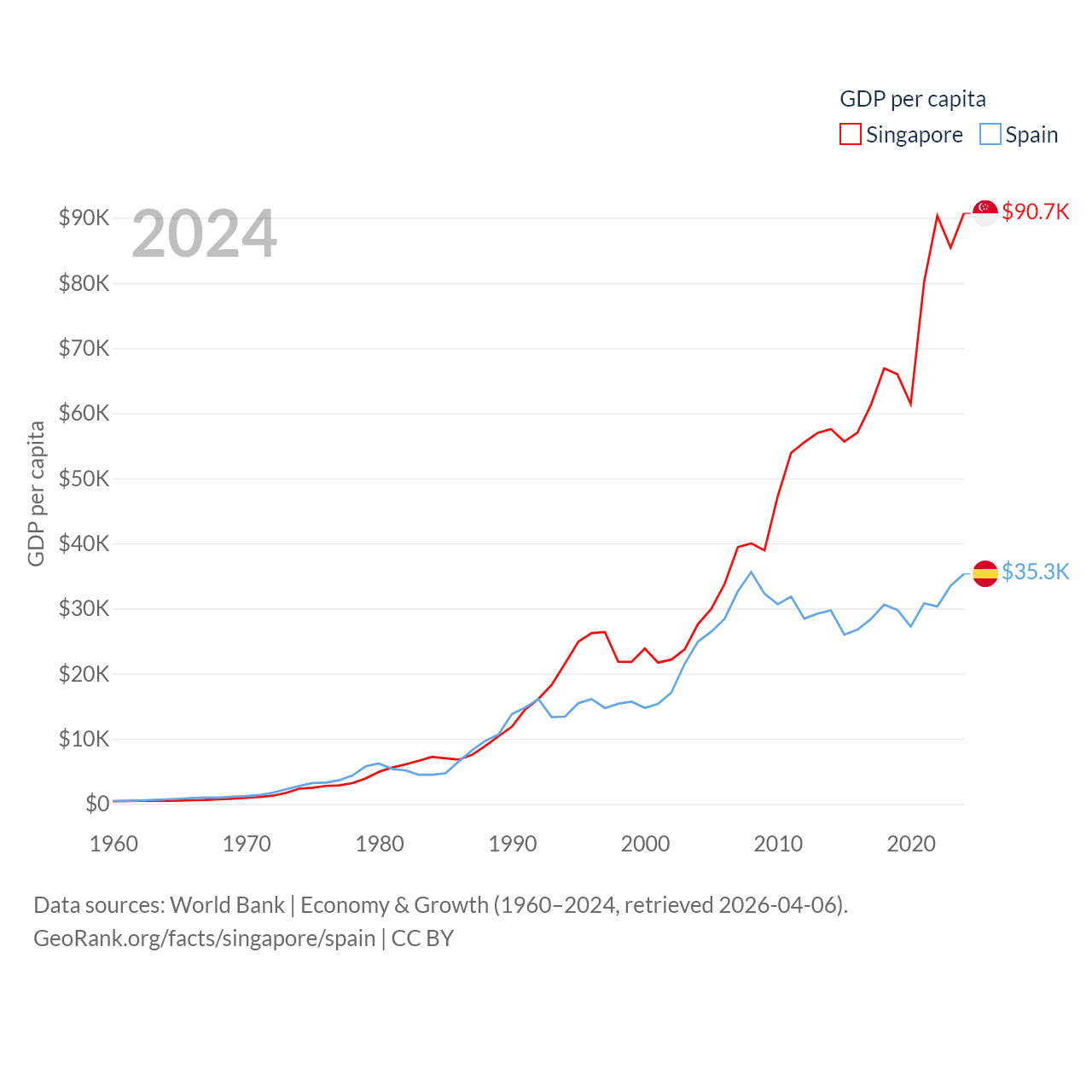 By GDP, Singapore ranks 28/197 ($547B) and Spain ranks 15/197 ($1.73T). By GDP per capita, Singapore ranks 7/197 ($90,674), while Spain ranks 32/197 ($35,327).