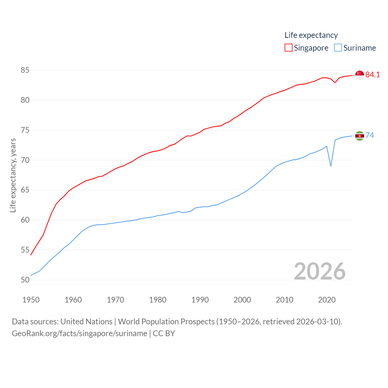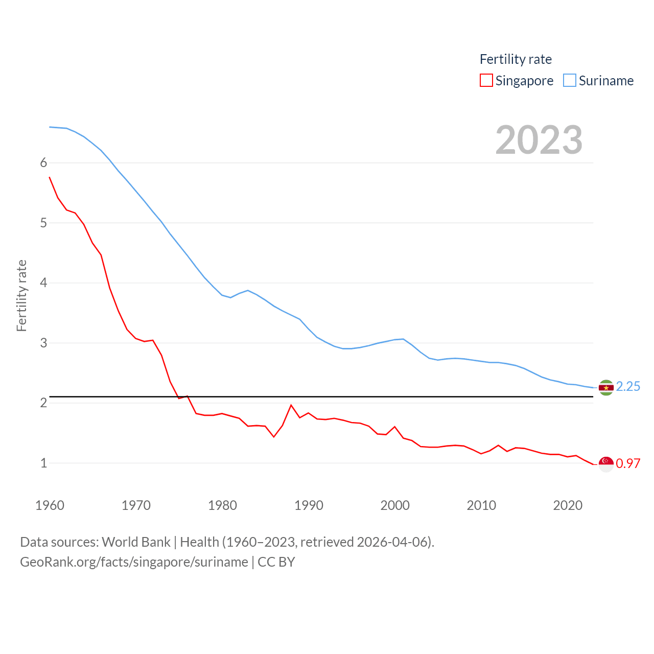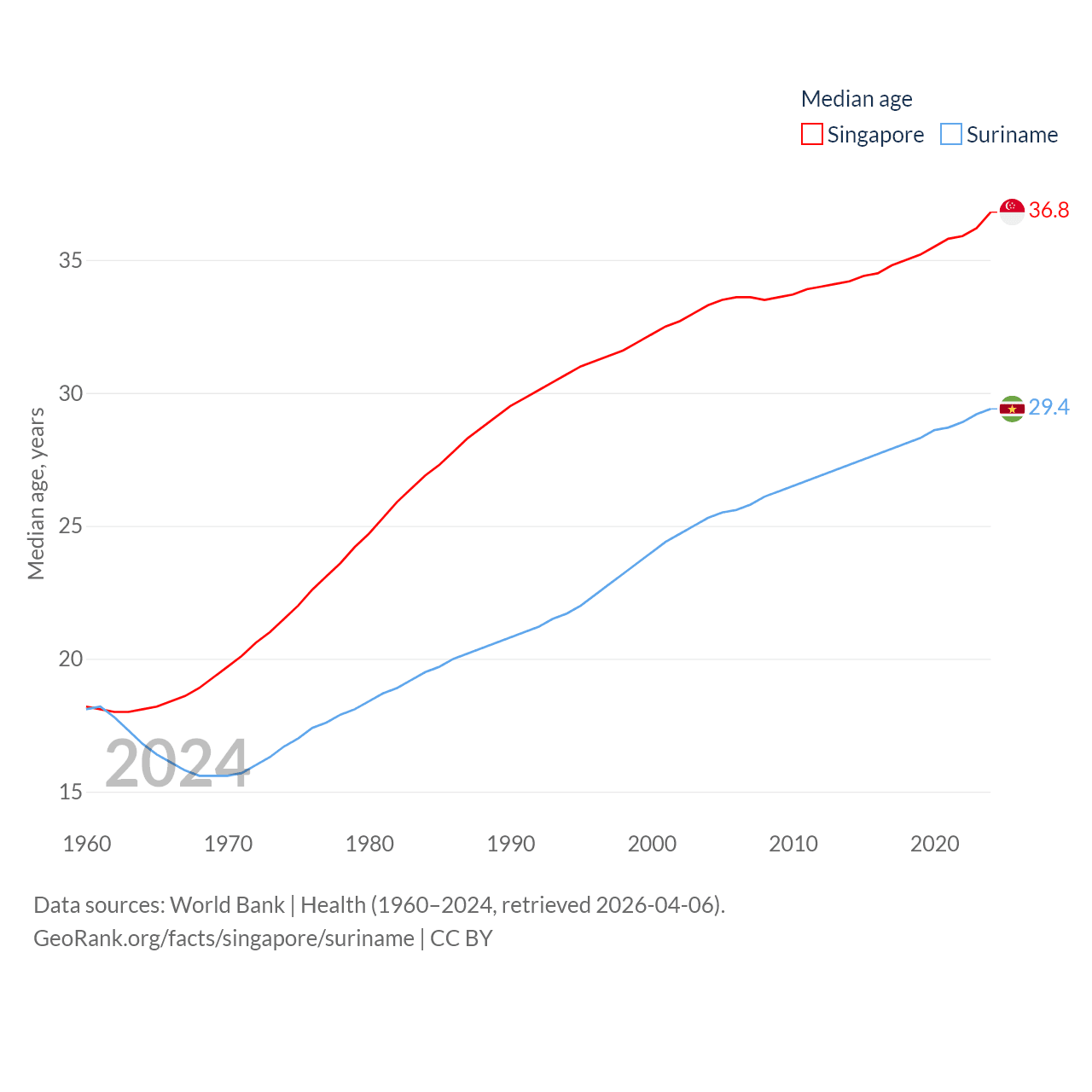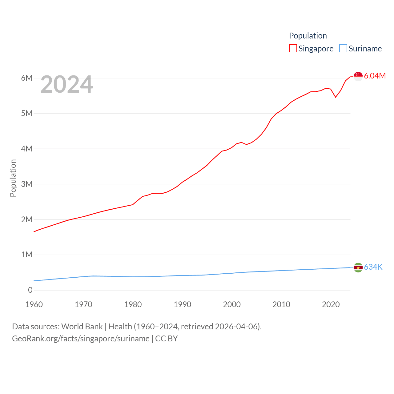 Singapore has a population of 6.04M (ranked 113/197), compared with 634K in Suriname (ranked 165/197). Singapore's land area is 277.2 sq mi versus 61,972 sq mi for Suriname (ranked 177th vs. 90th).
