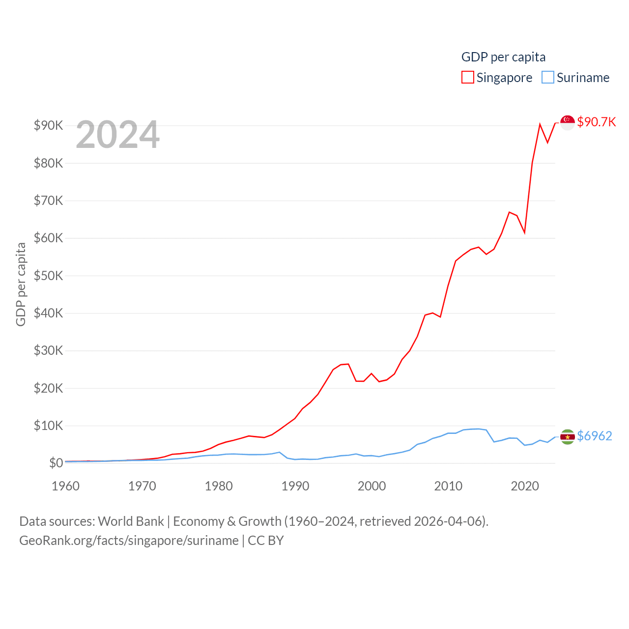 By GDP, Singapore ranks 28/197 ($547B) and Suriname ranks 164/197 ($4.42B). By GDP per capita, Singapore ranks 7/197 ($90,674), while Suriname ranks 102/197 ($6,962).