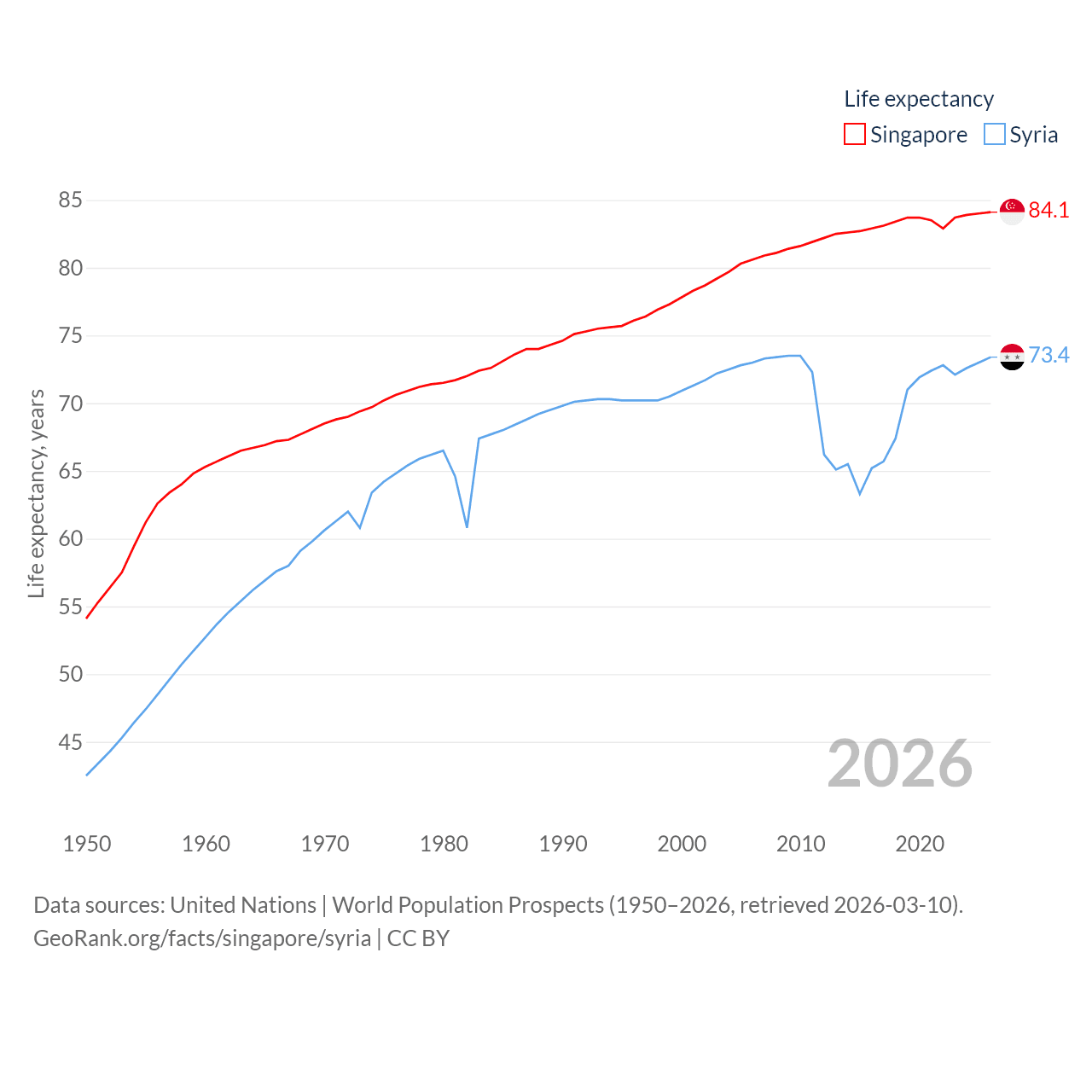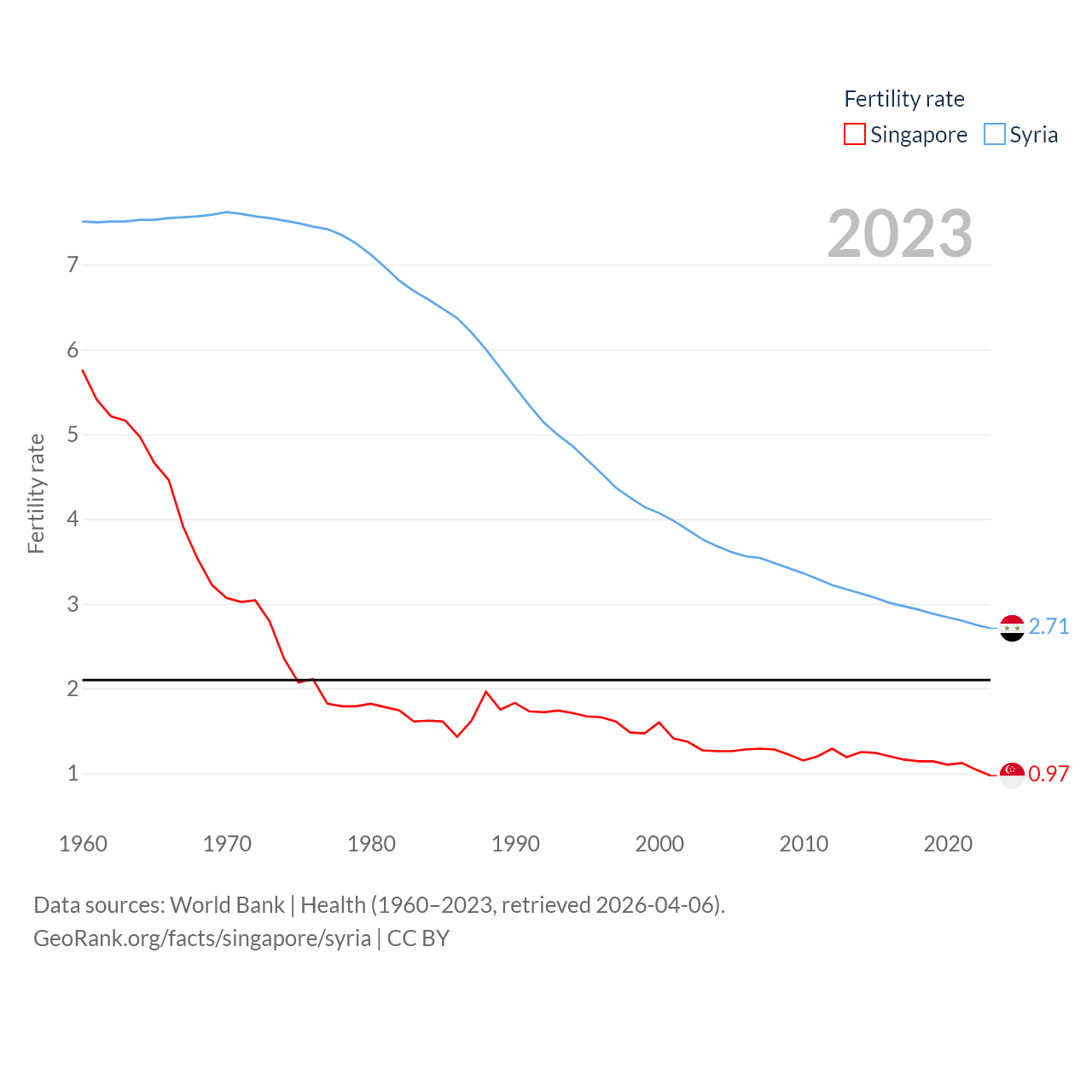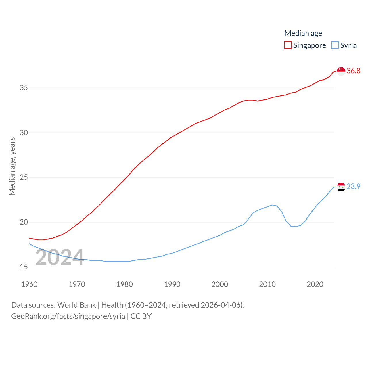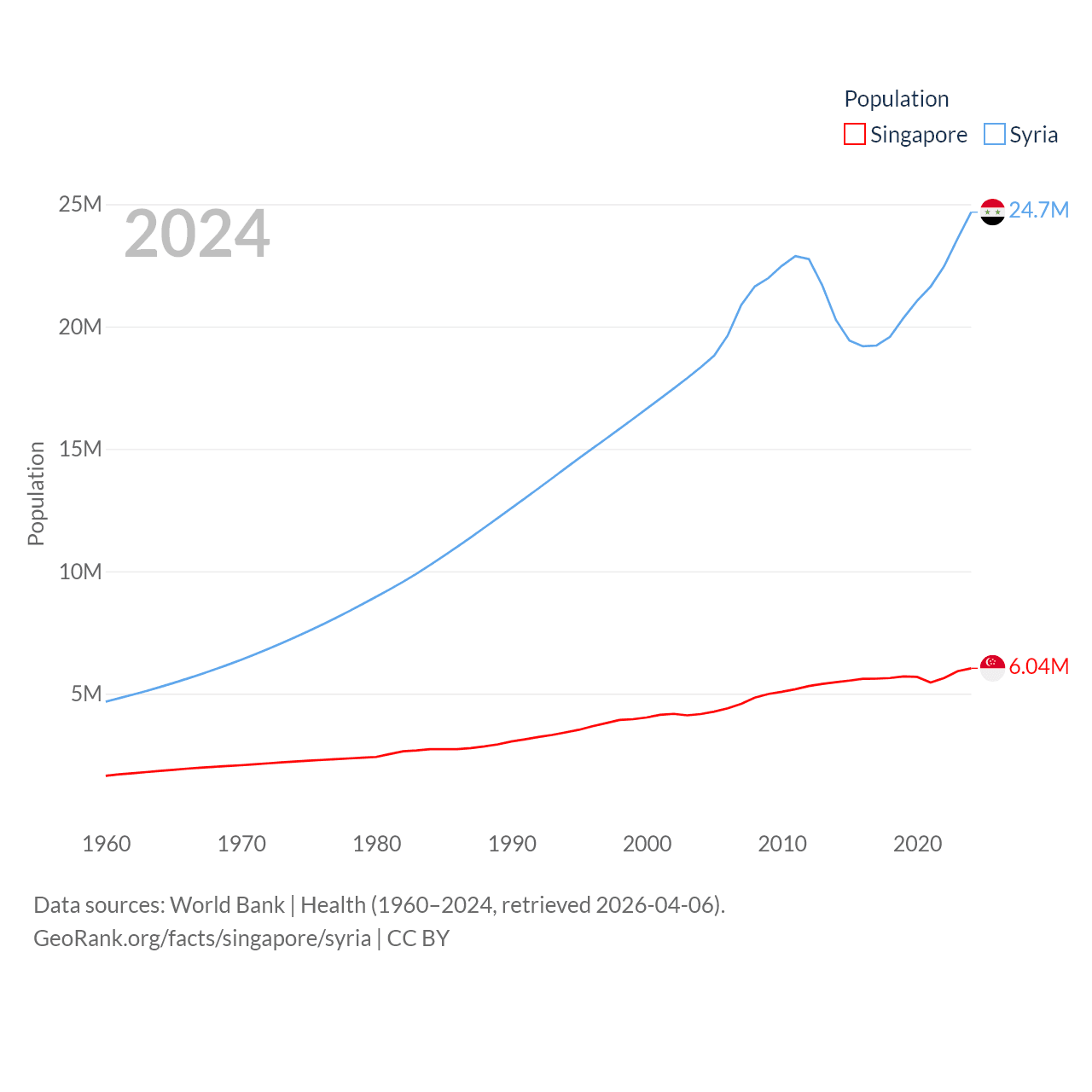 Singapore has a population of 6.04M (ranked 113/197), compared with 24.7M in Syria (ranked 57/197). Singapore's land area is 277.2 sq mi versus 70,900 sq mi for Syria (ranked 177th vs. 87th).