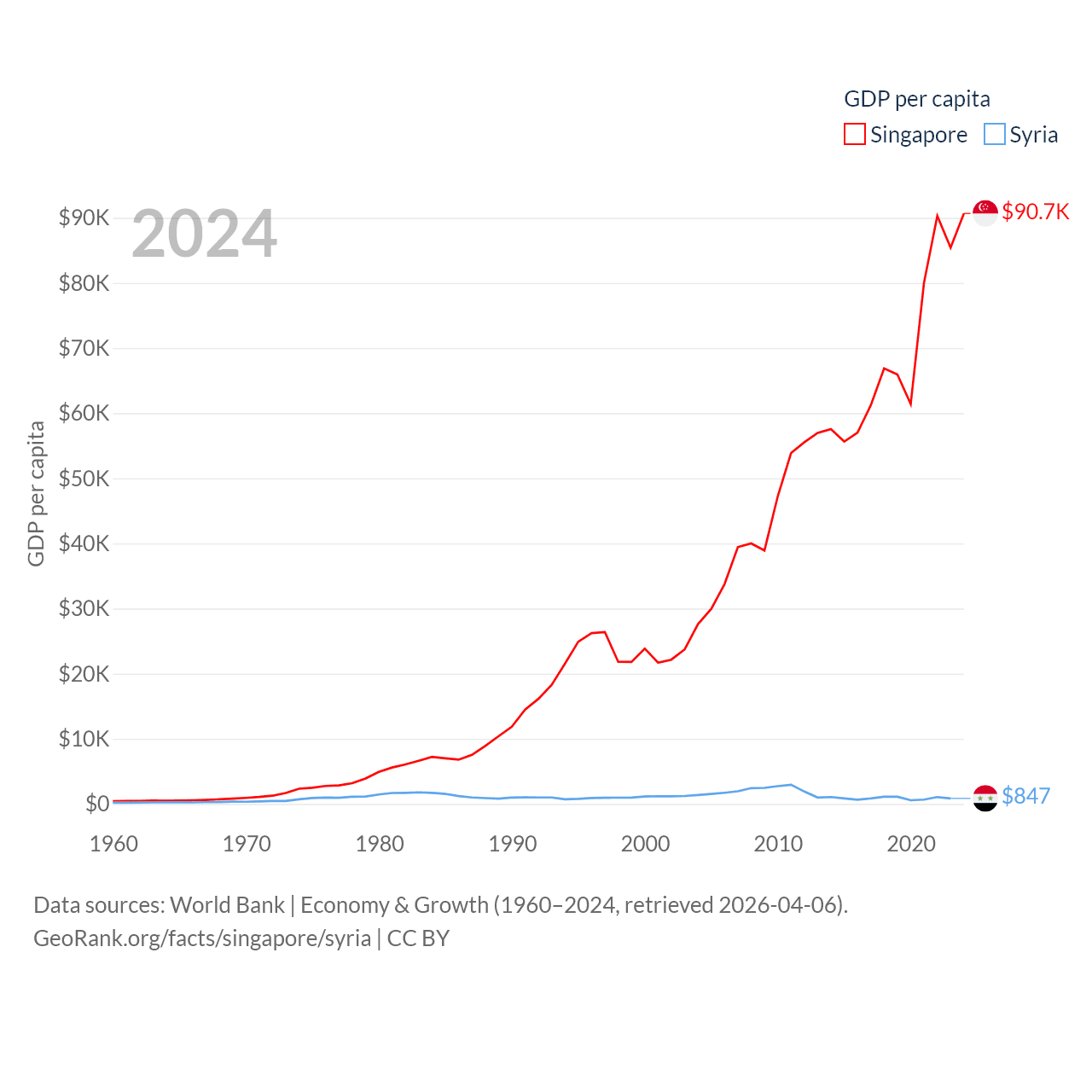 By GDP, Singapore ranks 28/197 ($547B) and Syria ranks 129/197 ($20B). By GDP per capita, Singapore ranks 7/197 ($90,674), while Syria ranks 185/197 ($847).