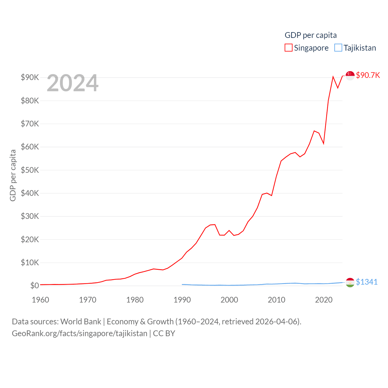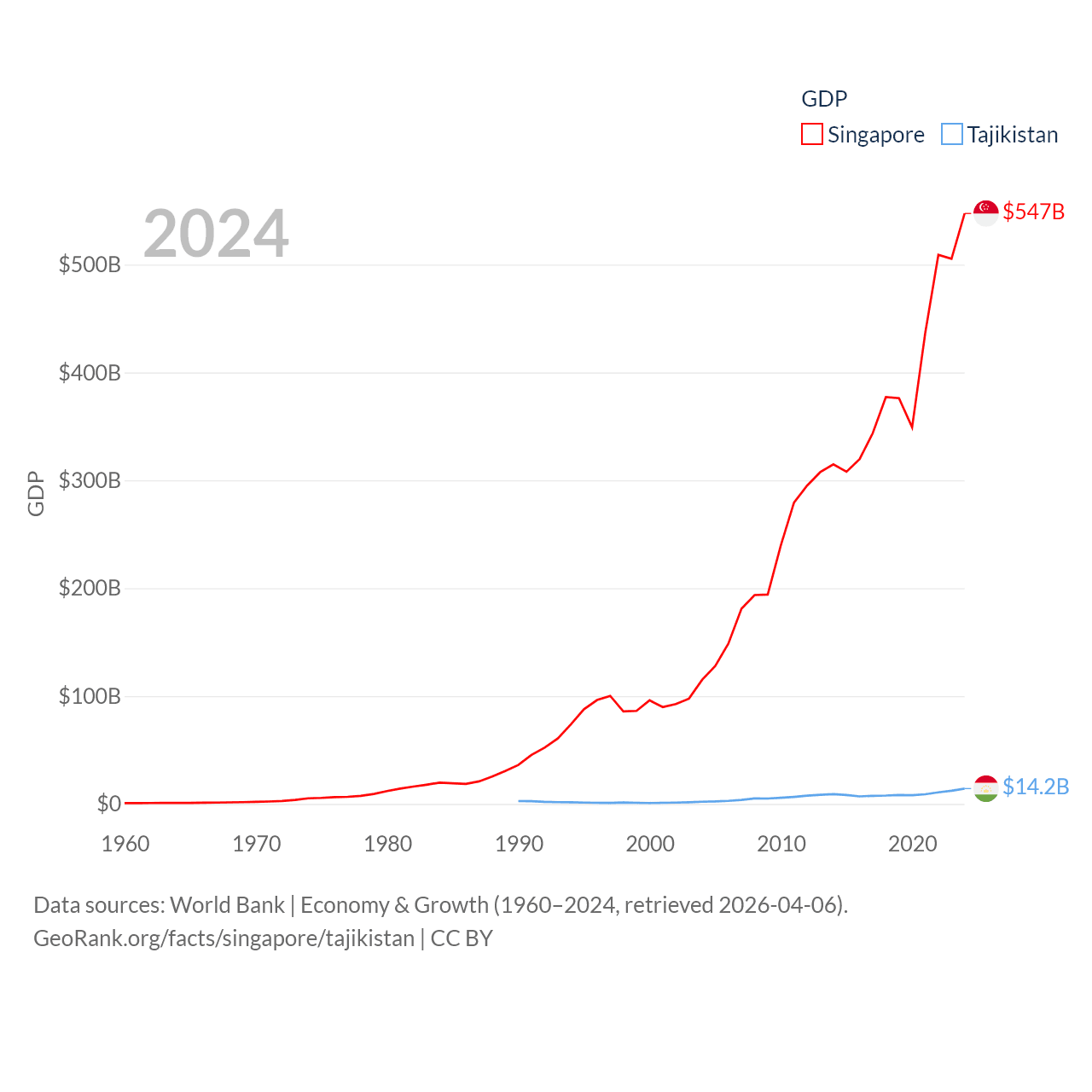By GDP, Singapore ranks 28/197 ($547B) and Tajikistan ranks 145/197 ($14.2B). By GDP per capita, Singapore ranks 7/197 ($90,674), while Tajikistan ranks 166/197 ($1,341).
