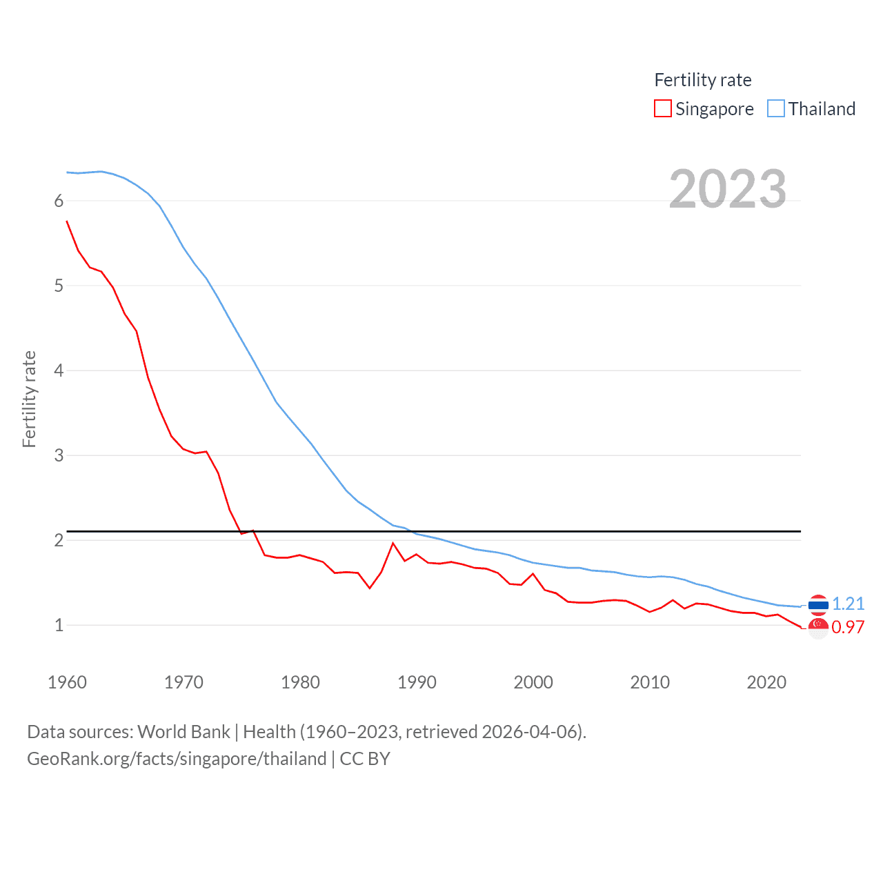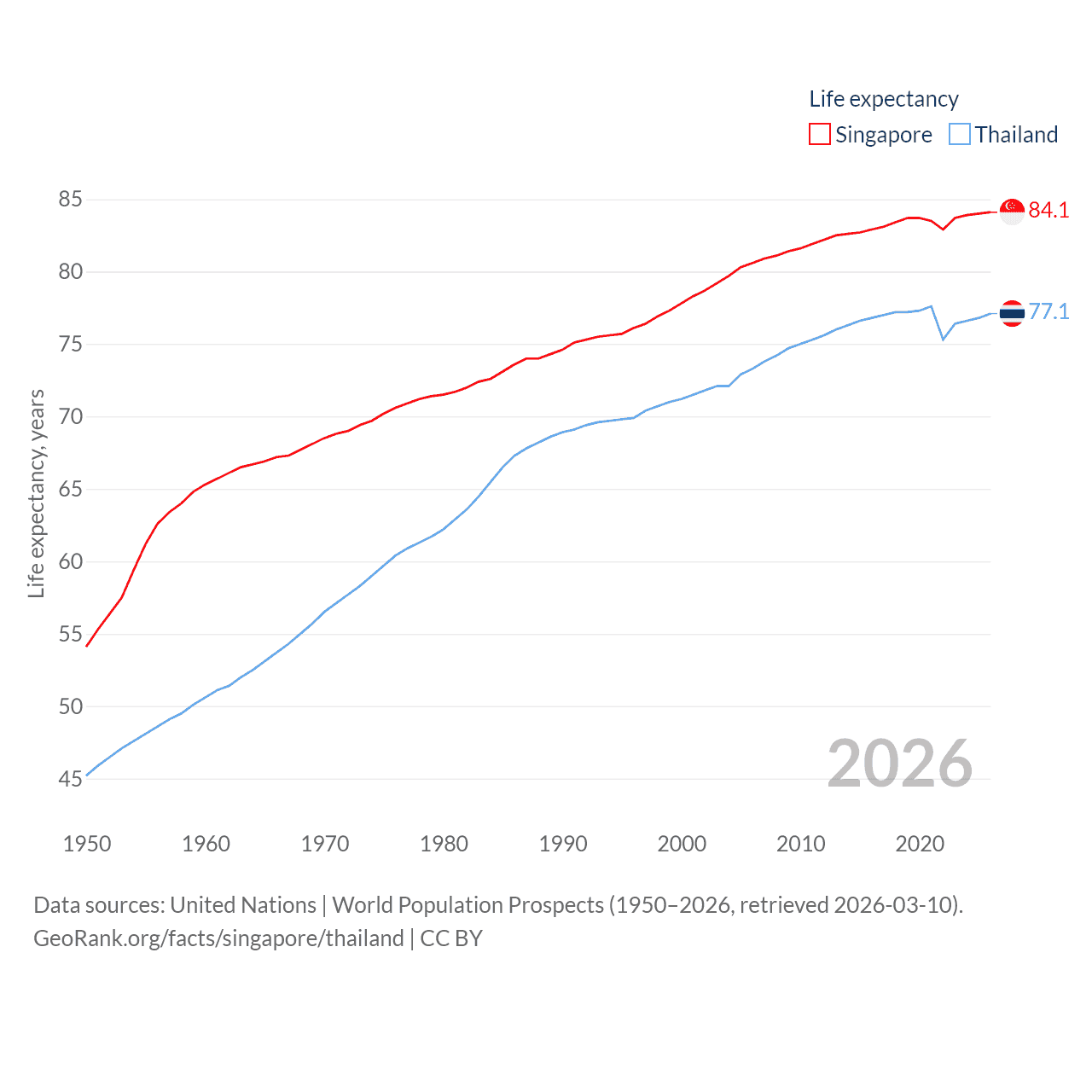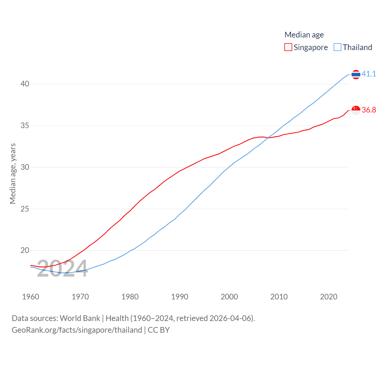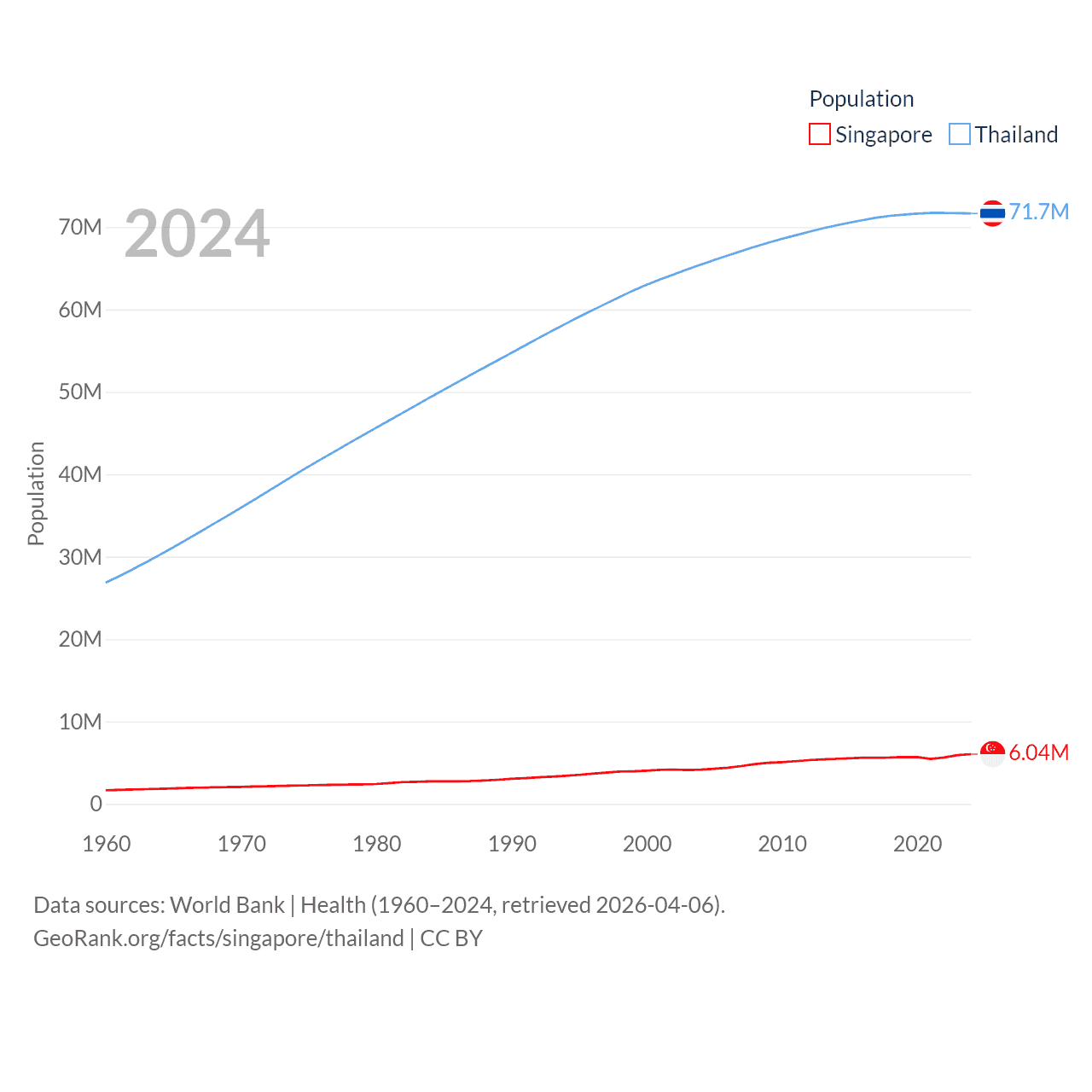 Singapore has a population of 6.04M (ranked 113/197), compared with 71.7M in Thailand (ranked 20/197). Singapore's land area is 277.2 sq mi versus 197,256 sq mi for Thailand (ranked 177th vs. 50th).
