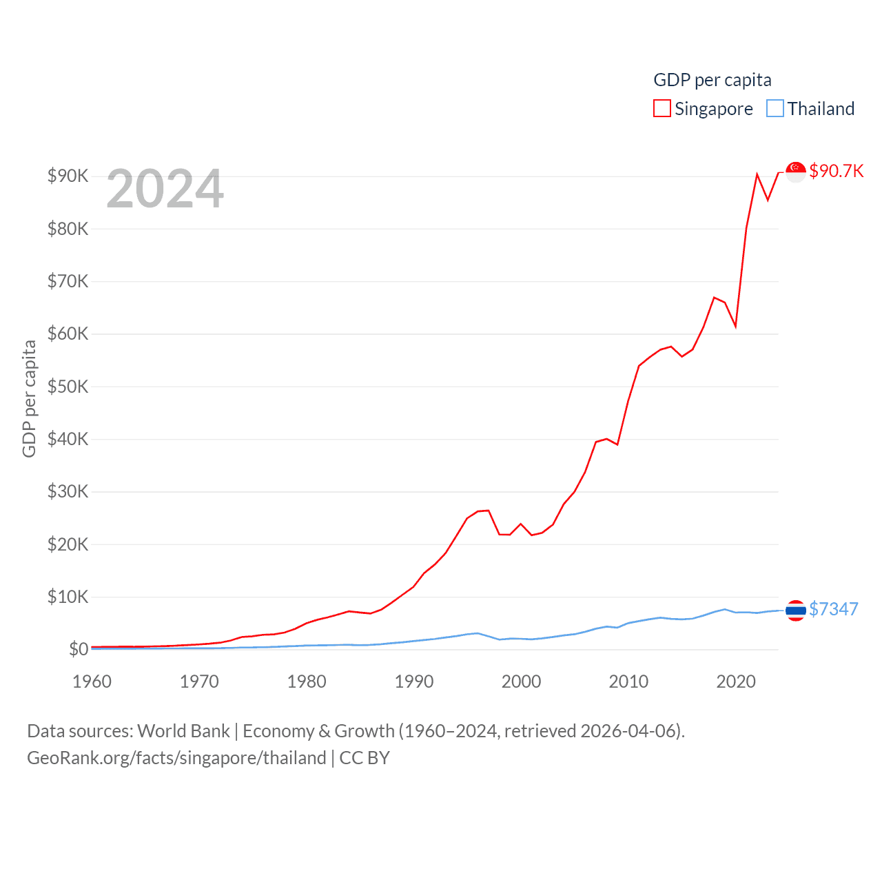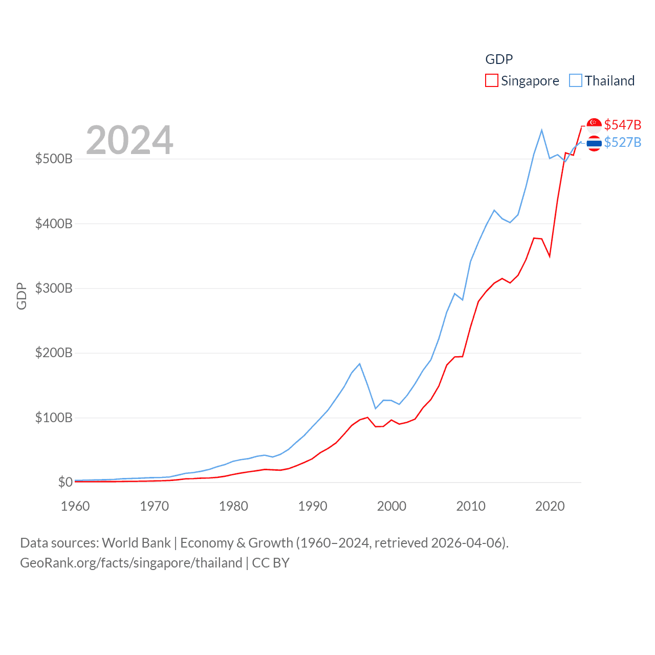 By GDP, Singapore ranks 28/197 ($547B) and Thailand ranks 31/197 ($527B). By GDP per capita, Singapore ranks 7/197 ($90,674), while Thailand ranks 100/197 ($7,347).