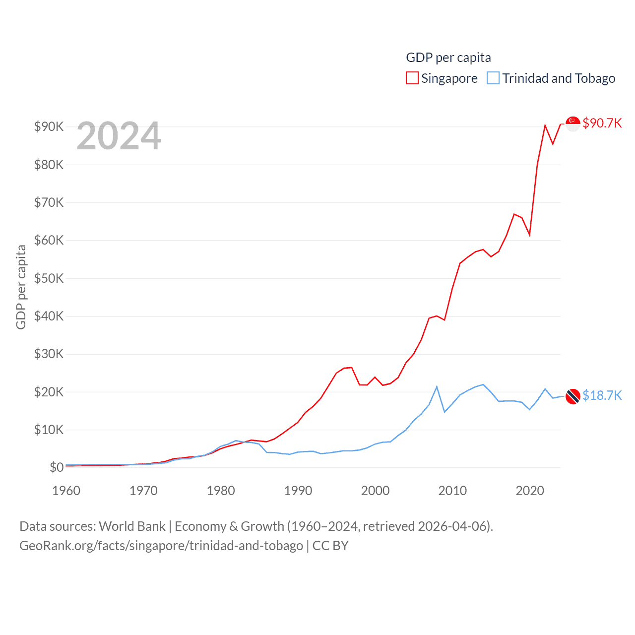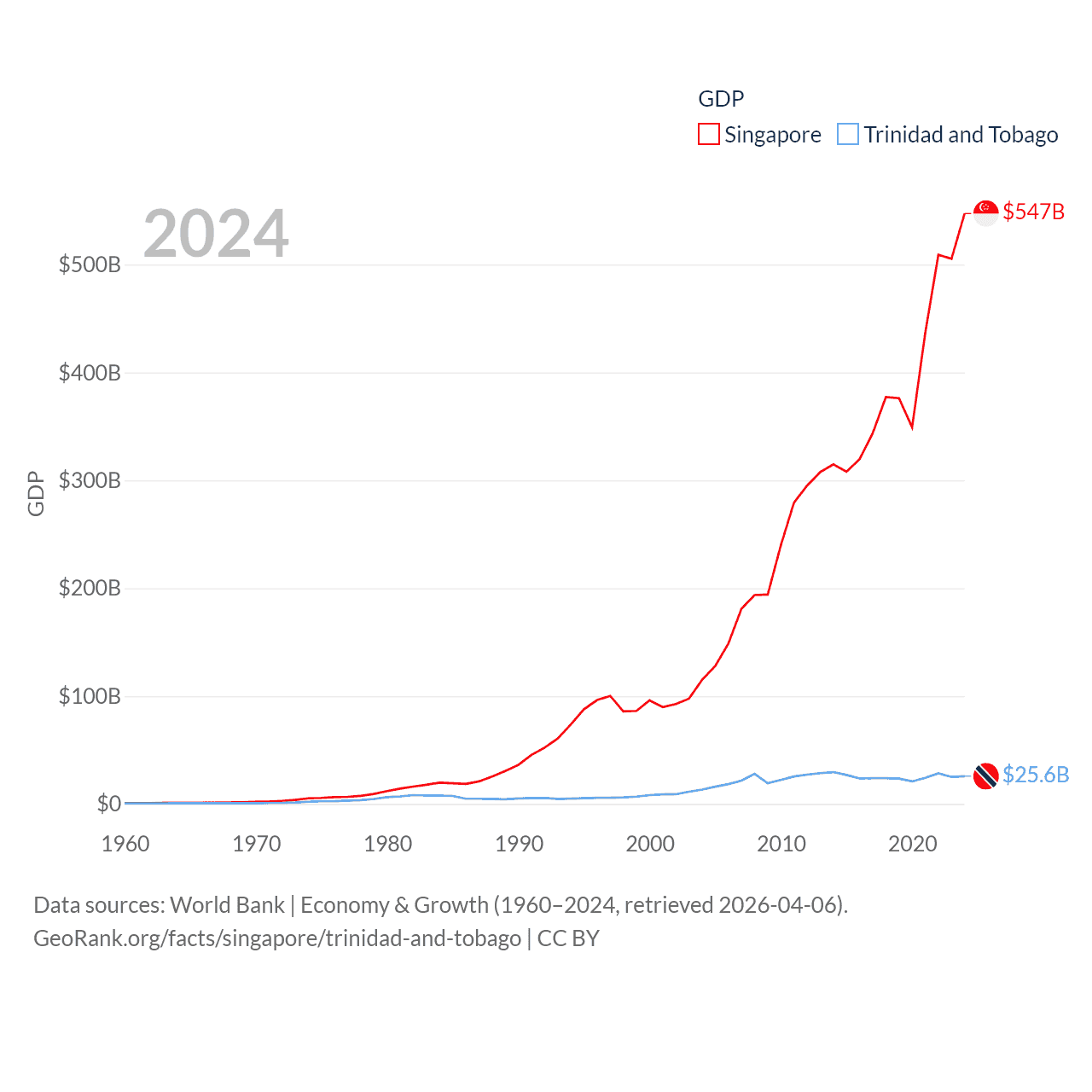 By GDP, Singapore ranks 28/197 ($547B) and Trinidad and Tobago ranks 115/197 ($25.6B). By GDP per capita, Singapore ranks 7/197 ($90,674), while Trinidad and Tobago ranks 61/197 ($18,733).