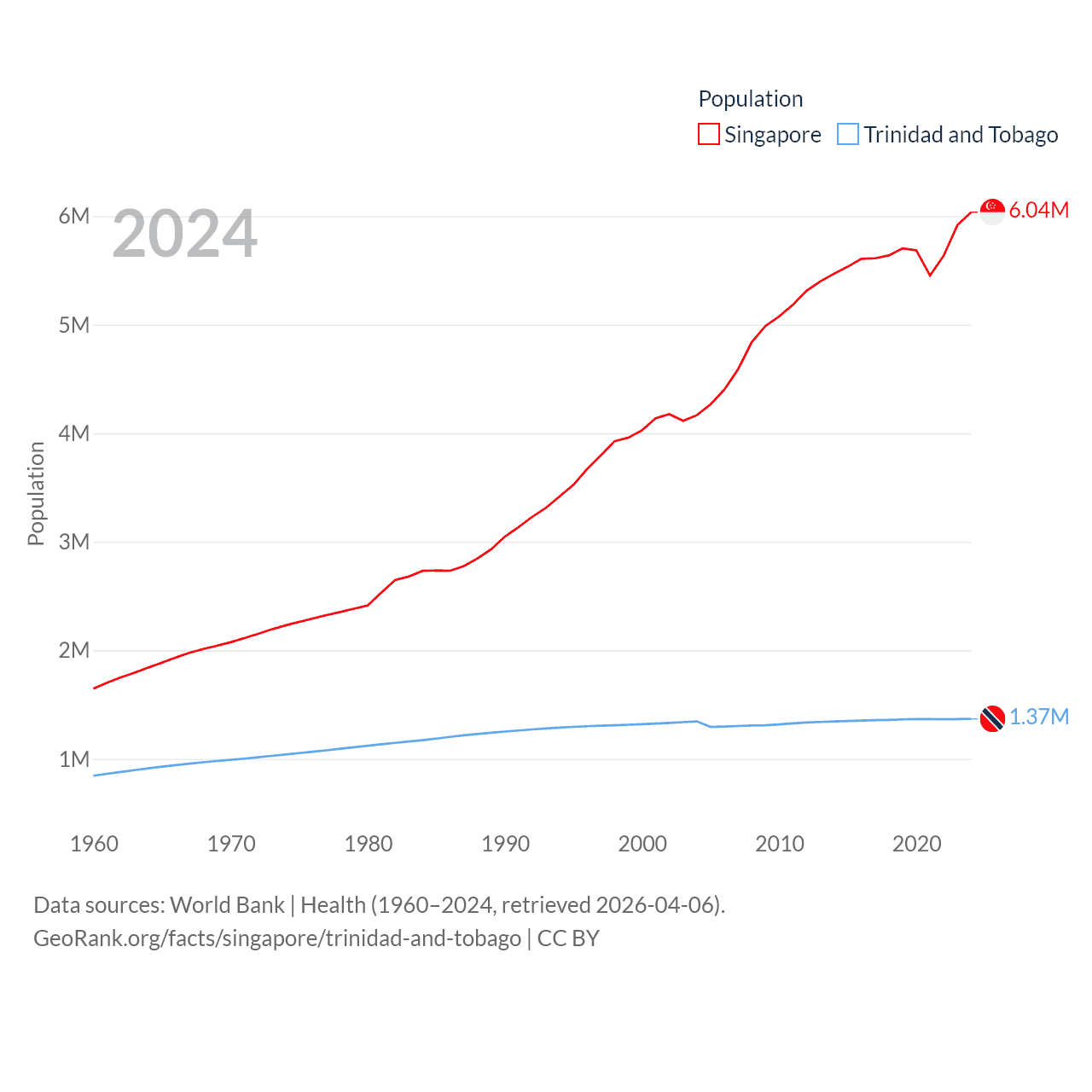 Singapore has a population of 6.04M (ranked 113/197), compared with 1.37M in Trinidad and Tobago (ranked 154/197). Singapore's land area is 277.2 sq mi versus 1,981 sq mi for Trinidad and Tobago (ranked 177th vs. 166th).