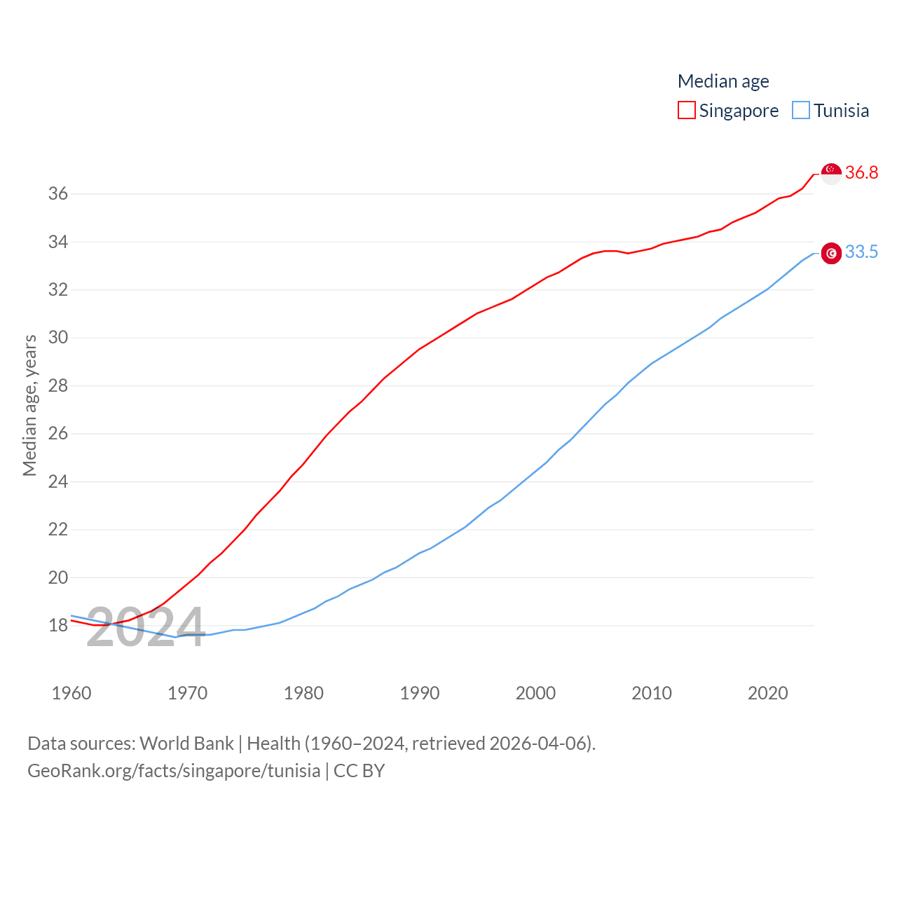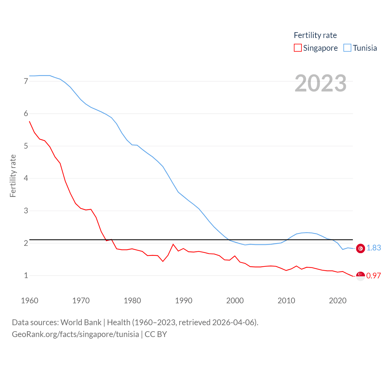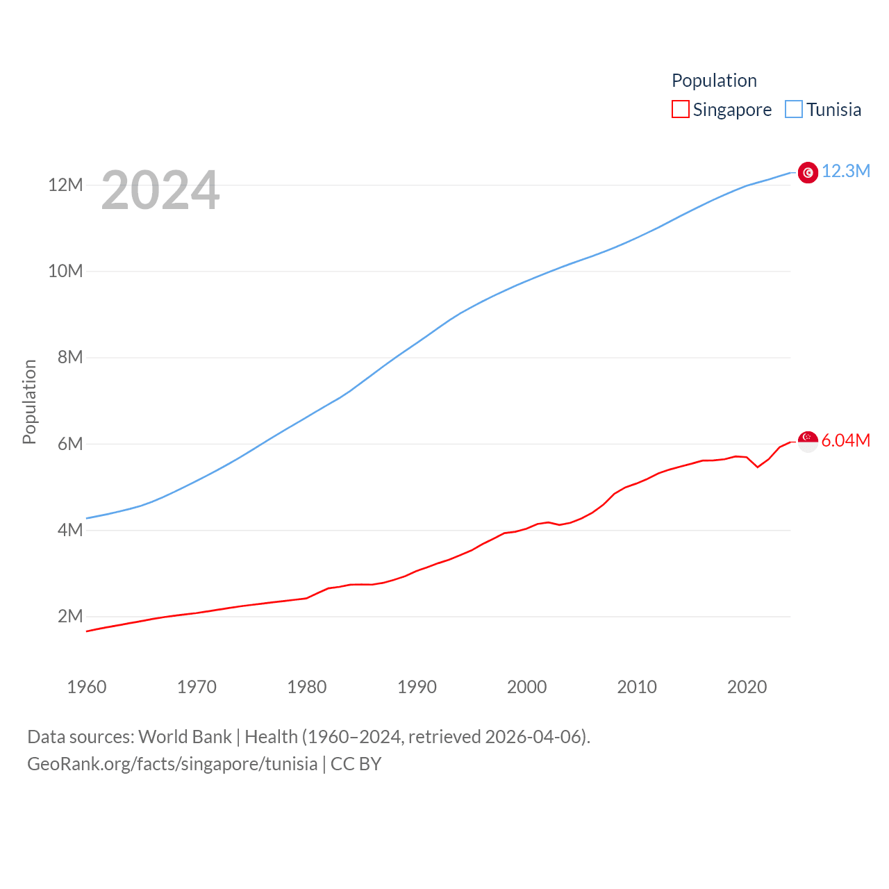 Singapore has a population of 6.04M (ranked 113/197), compared with 12.3M in Tunisia (ranked 80/197). Singapore's land area is 277.2 sq mi versus 59,985 sq mi for Tunisia (ranked 177th vs. 91st).