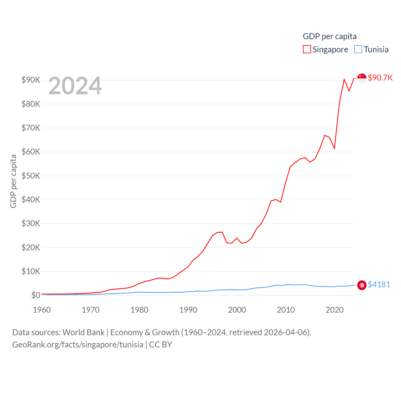 By GDP, Singapore ranks 28/197 ($547B) and Tunisia ranks 93/197 ($51.3B). By GDP per capita, Singapore ranks 7/197 ($90,674), while Tunisia ranks 129/197 ($4,181).