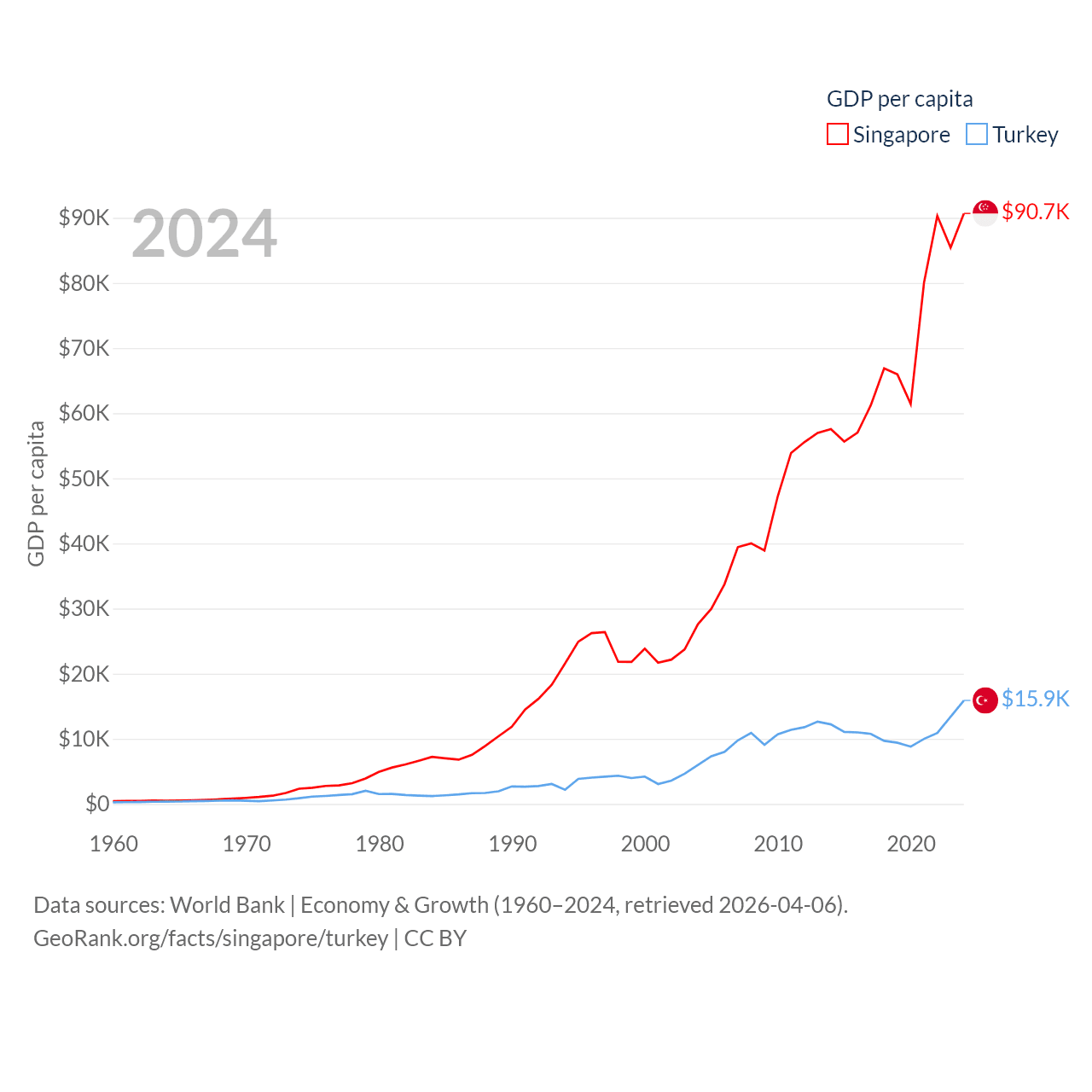 By GDP, Singapore ranks 28/197 ($547B) and Turkey ranks 17/197 ($1.36T). By GDP per capita, Singapore ranks 7/197 ($90,674), while Turkey ranks 66/197 ($15,893).