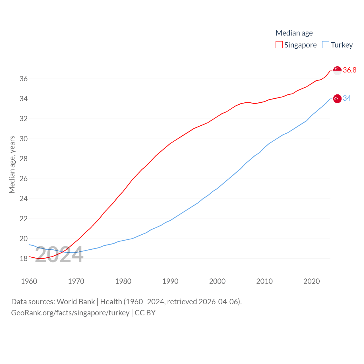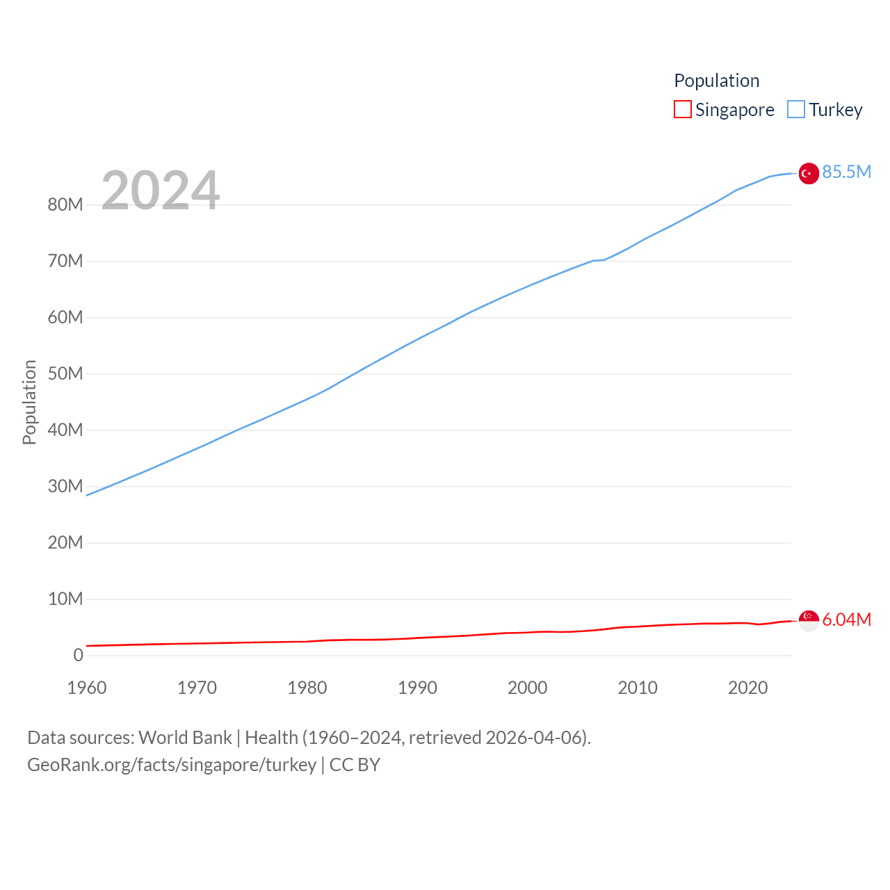 Singapore has a population of 6.04M (ranked 113/197), compared with 85.5M in Turkey (ranked 18/197). Singapore's land area is 277.2 sq mi versus 297,156 sq mi for Turkey (ranked 177th vs. 36th).