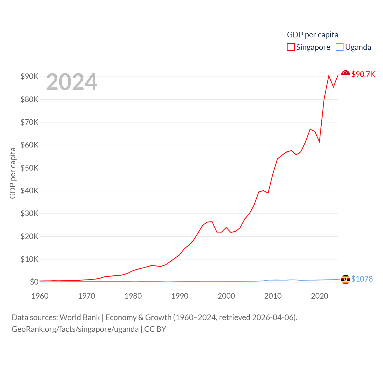 By GDP, Singapore ranks 28/197 ($547B) and Uganda ranks 89/197 ($53.9B). By GDP per capita, Singapore ranks 7/197 ($90,674), while Uganda ranks 176/197 ($1,078).