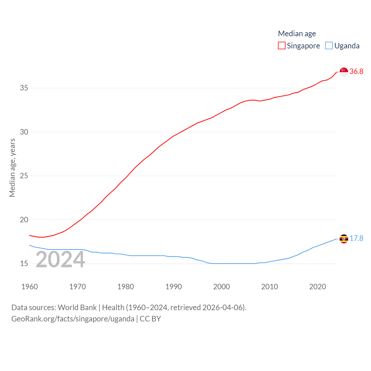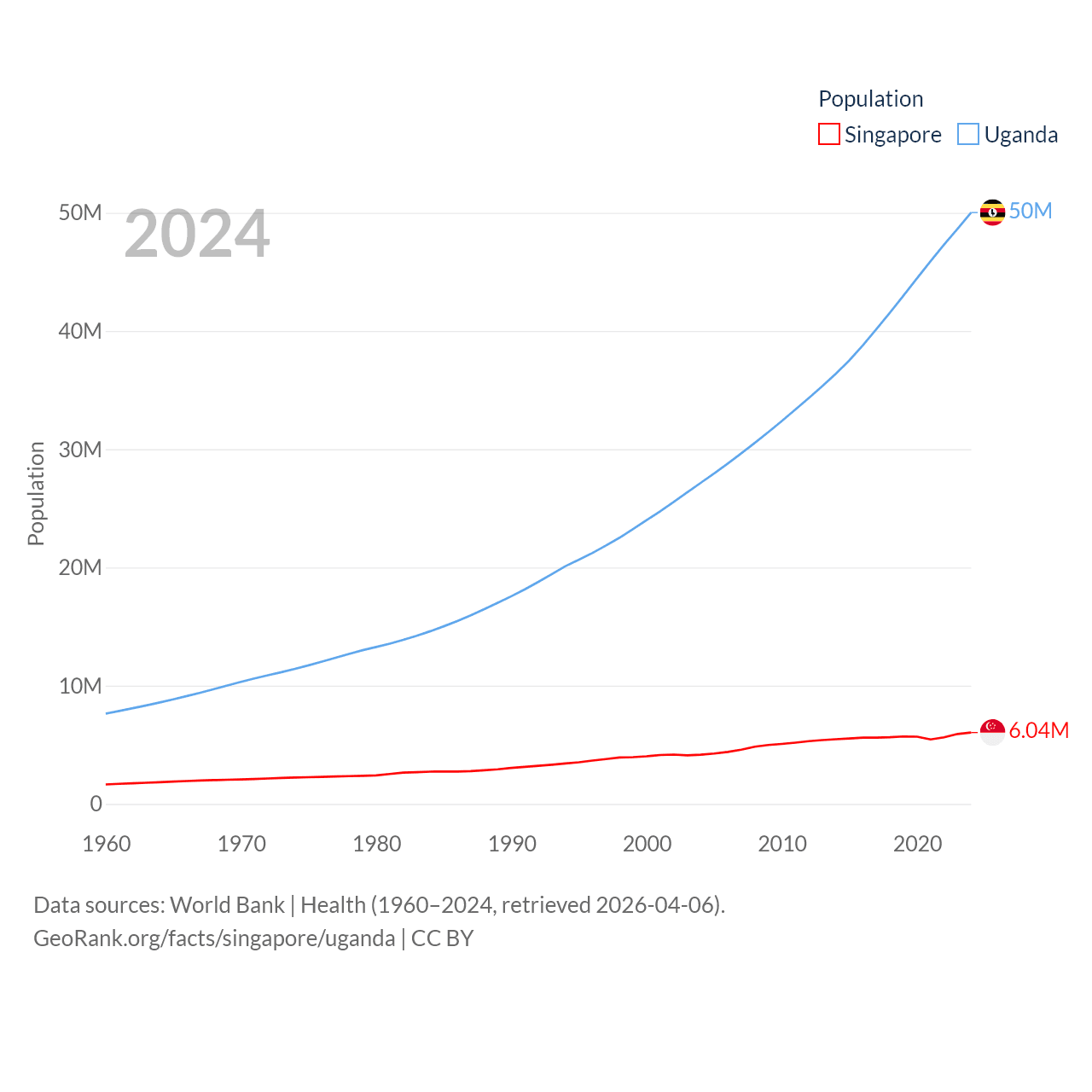 Singapore has a population of 6.04M (ranked 113/197), compared with 50M in Uganda (ranked 31/197). Singapore's land area is 277.2 sq mi versus 77,421 sq mi for Uganda (ranked 177th vs. 84th).