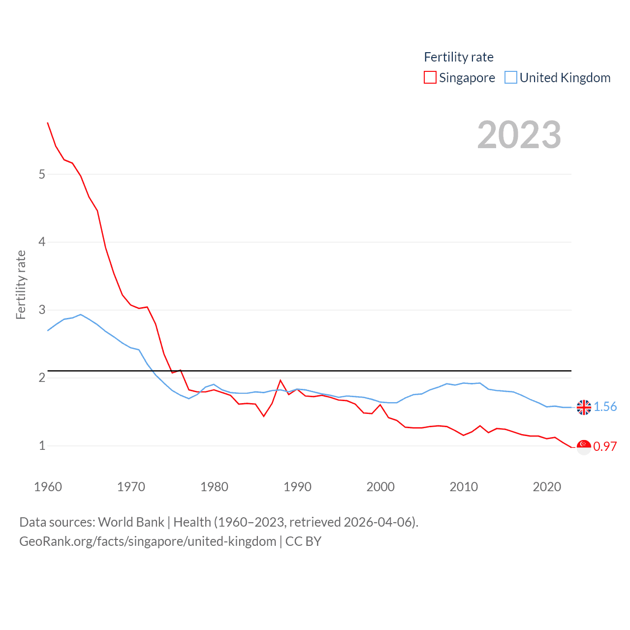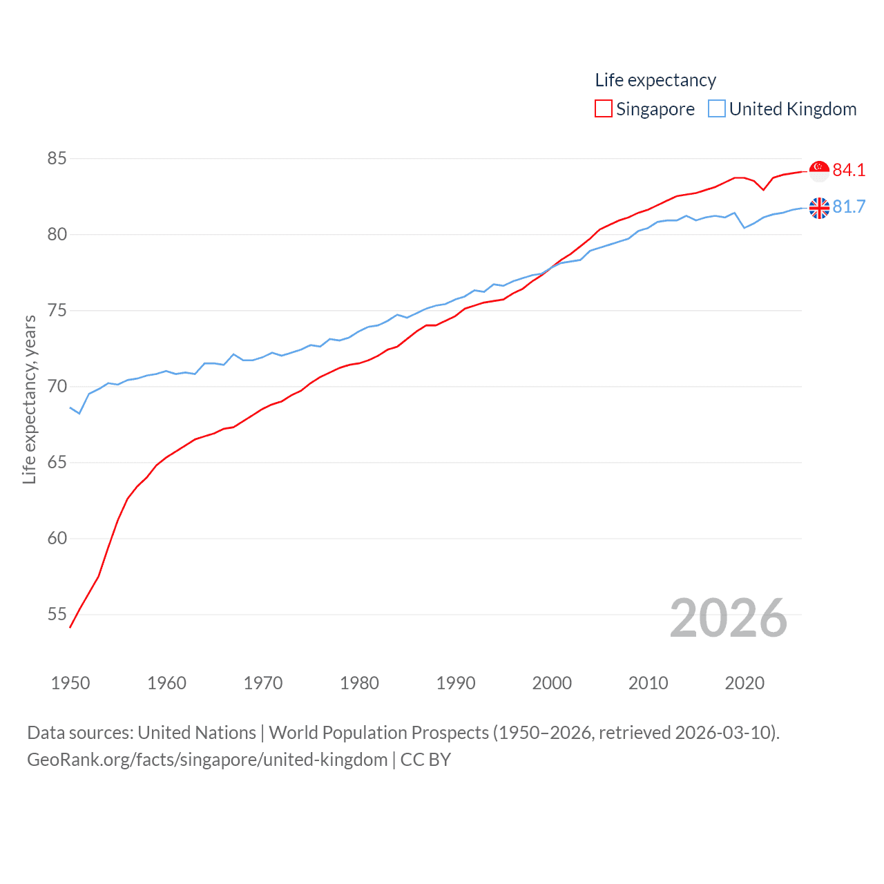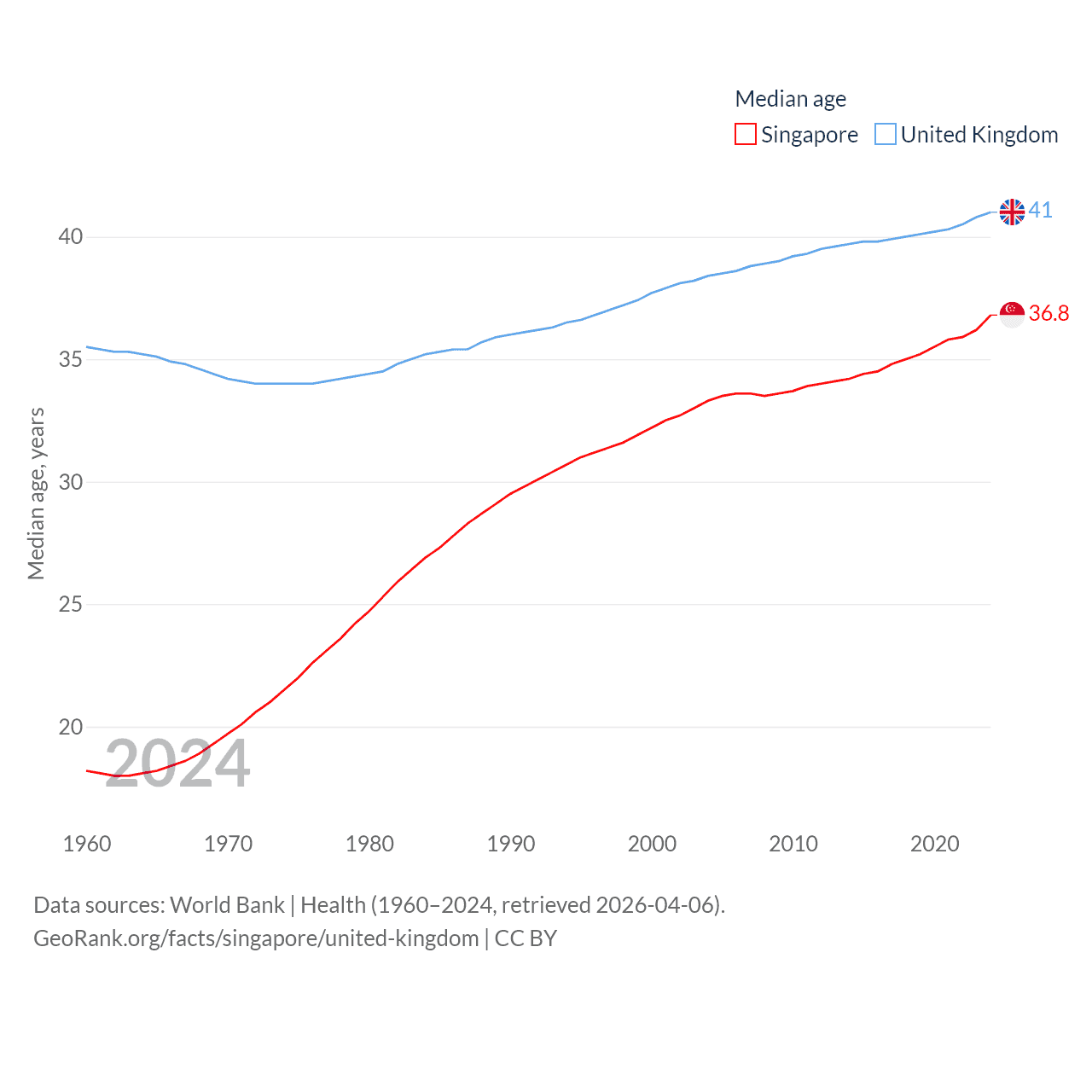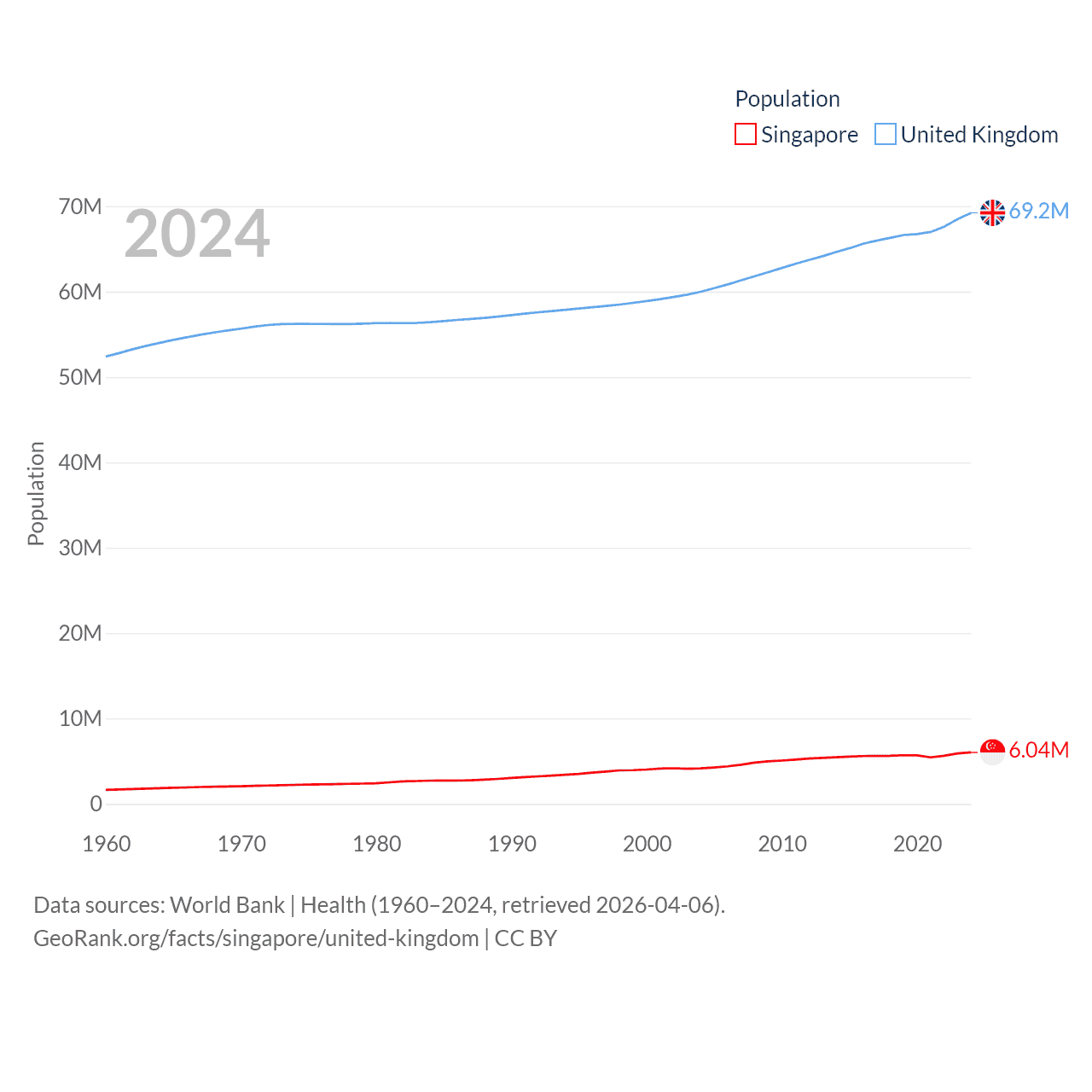 Singapore has a population of 6.04M (ranked 113/197), compared with 69.2M in The United Kingdom (ranked 21/197). Singapore's land area is 277.2 sq mi versus 93,410 sq mi for The United Kingdom (ranked 177th vs. 78th).