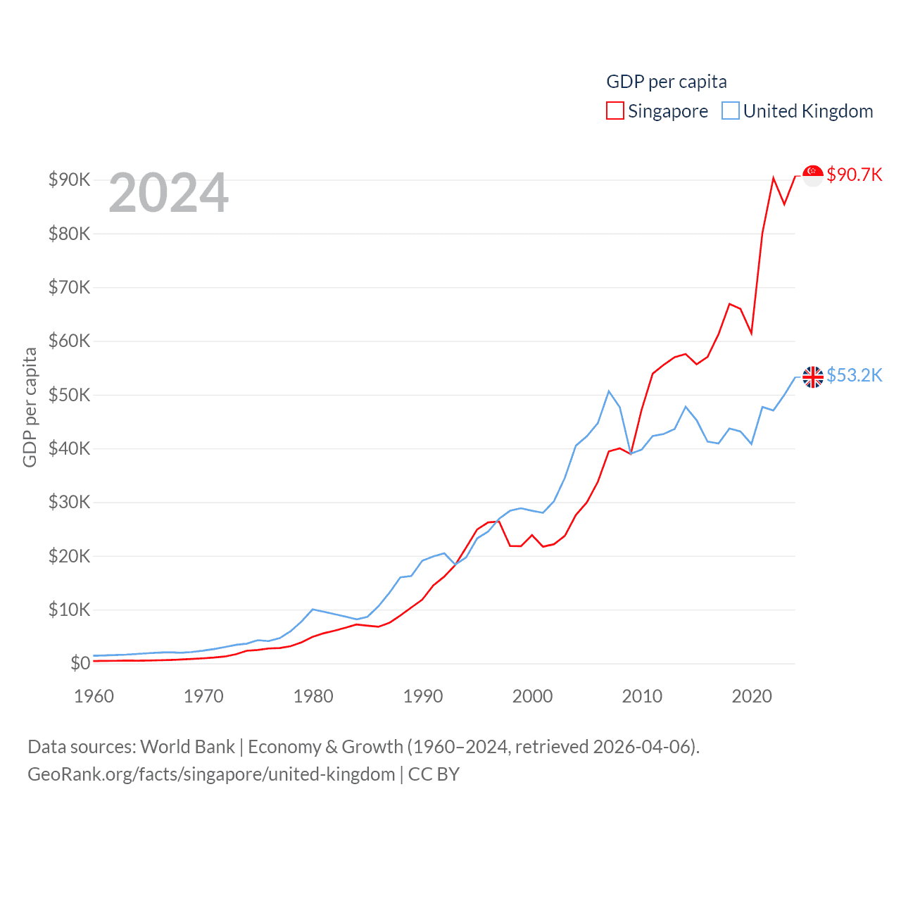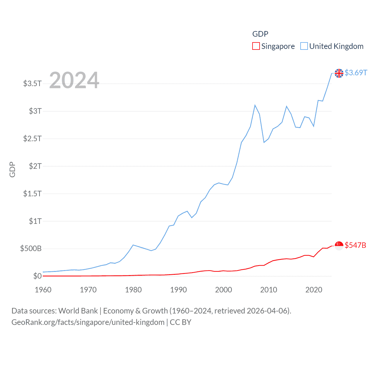 By GDP, Singapore ranks 28/197 ($547B) and The United Kingdom ranks 6/197 ($3.69T). By GDP per capita, Singapore ranks 7/197 ($90,674), while The United Kingdom ranks 22/197 ($53,246).