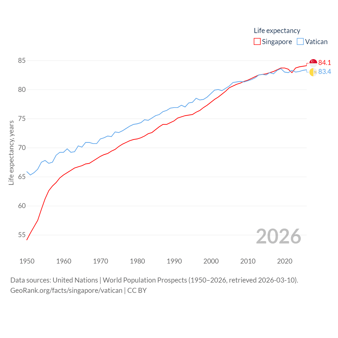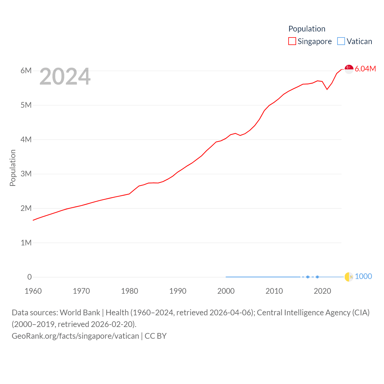 Singapore has a population of 6.04M (ranked 113/197), compared with 1K in The Vatican (ranked 197/197). Singapore's land area is 277.2 sq mi versus 0.17 sq mi for The Vatican (ranked 177th vs. 197th).