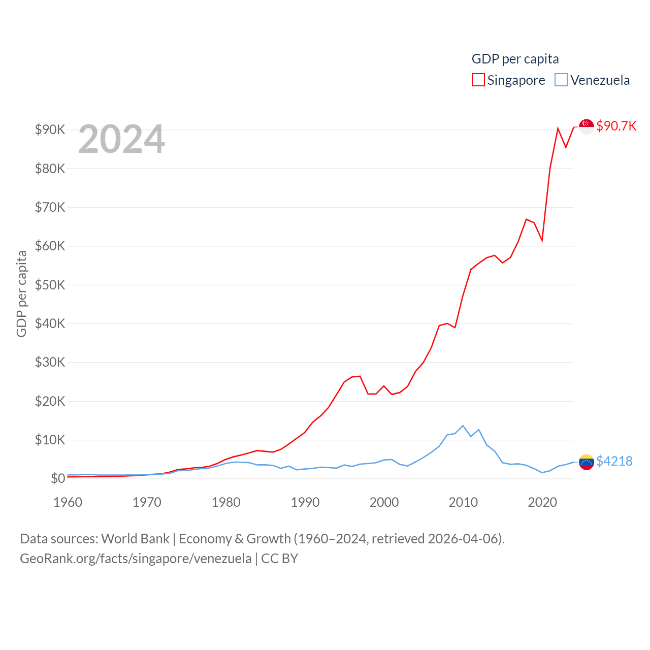 By GDP, Singapore ranks 28/197 ($547B) and Venezuela ranks 65/197 ($120B). By GDP per capita, Singapore ranks 7/197 ($90,674), while Venezuela ranks 128/197 ($4,218).