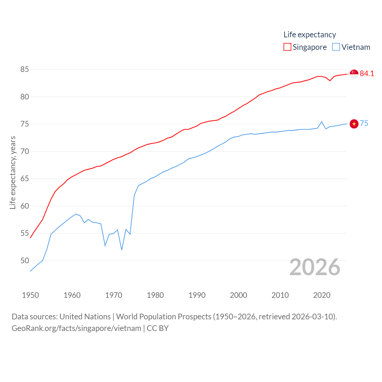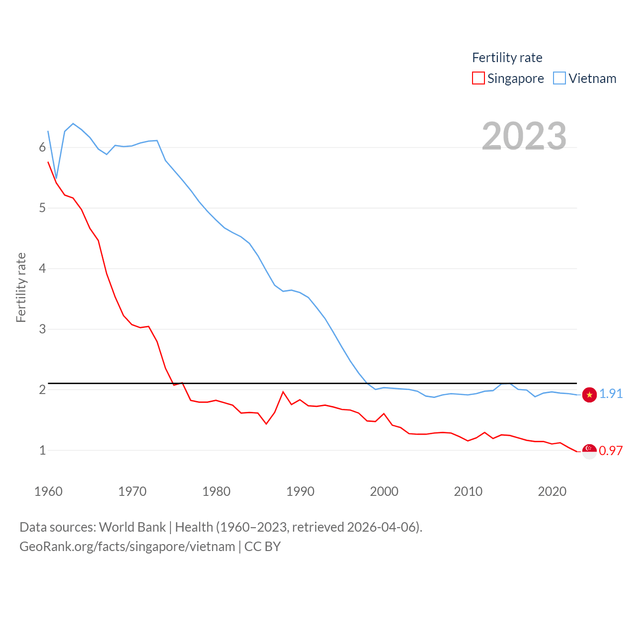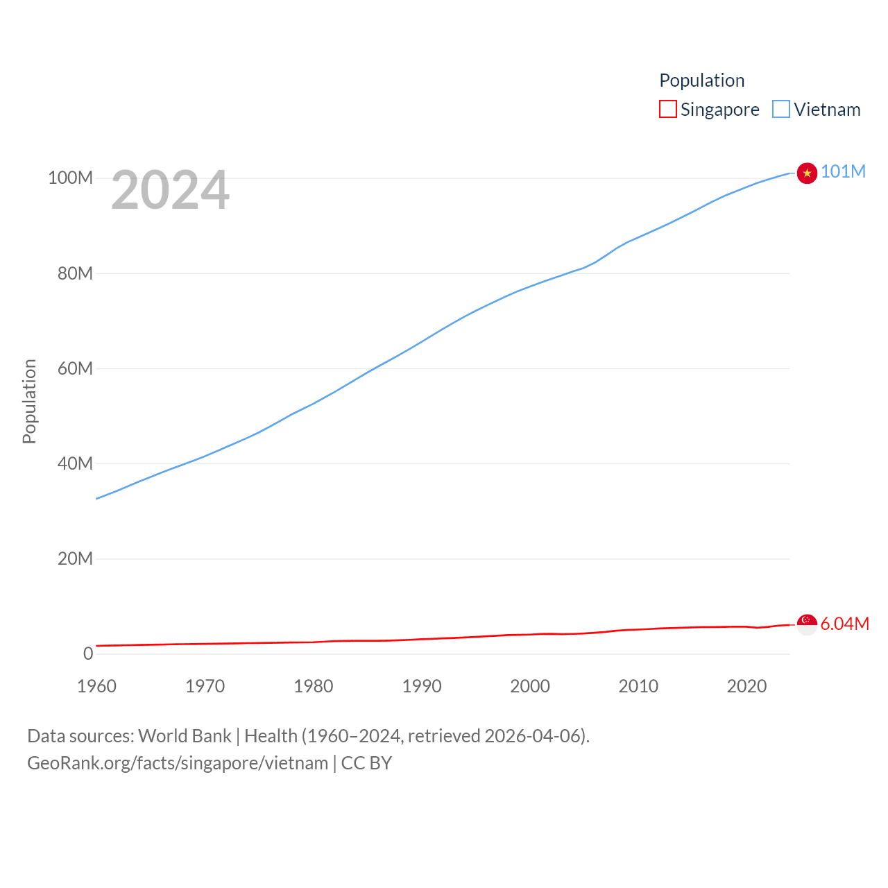 Singapore has a population of 6.04M (ranked 113/197), compared with 101M in Vietnam (ranked 16/197). Singapore's land area is 277.2 sq mi versus 121,016 sq mi for Vietnam (ranked 177th vs. 67th).