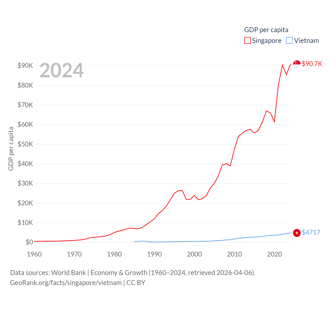 By GDP, Singapore ranks 28/197 ($547B) and Vietnam ranks 33/197 ($476B). By GDP per capita, Singapore ranks 7/197 ($90,674), while Vietnam ranks 122/197 ($4,717).