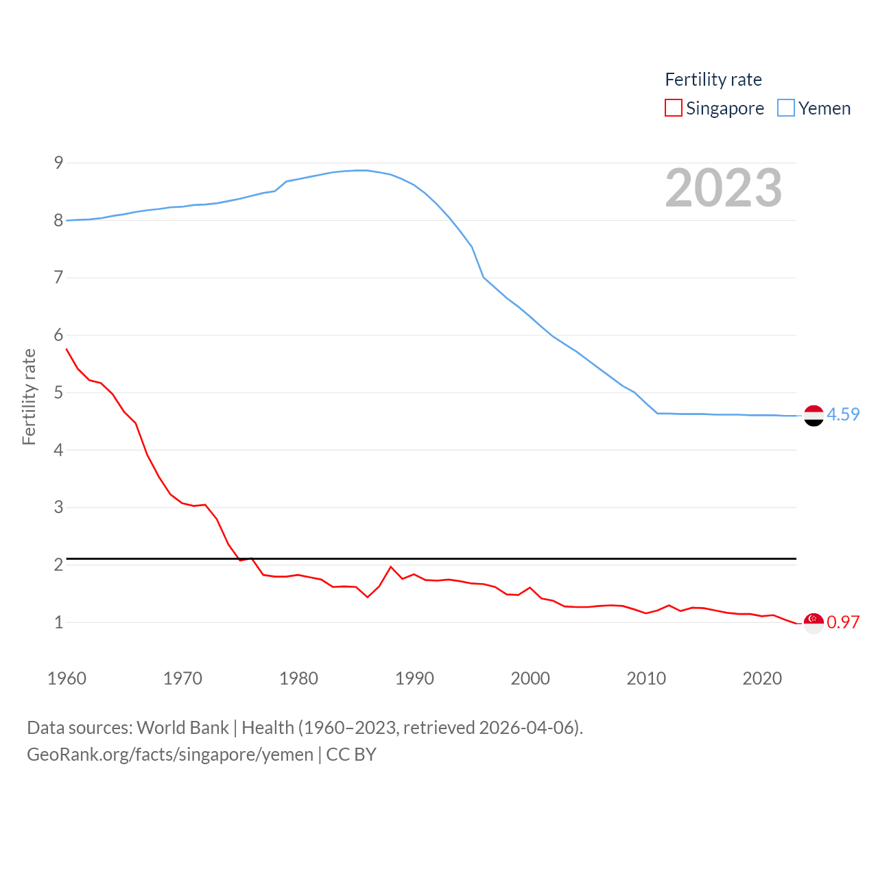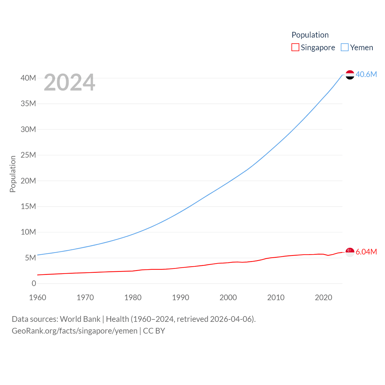Singapore has a population of 6.04M (ranked 113/197), compared with 40.6M in Yemen (ranked 38/197). Singapore's land area is 277.2 sq mi versus 203,850 sq mi for Yemen (ranked 177th vs. 49th).