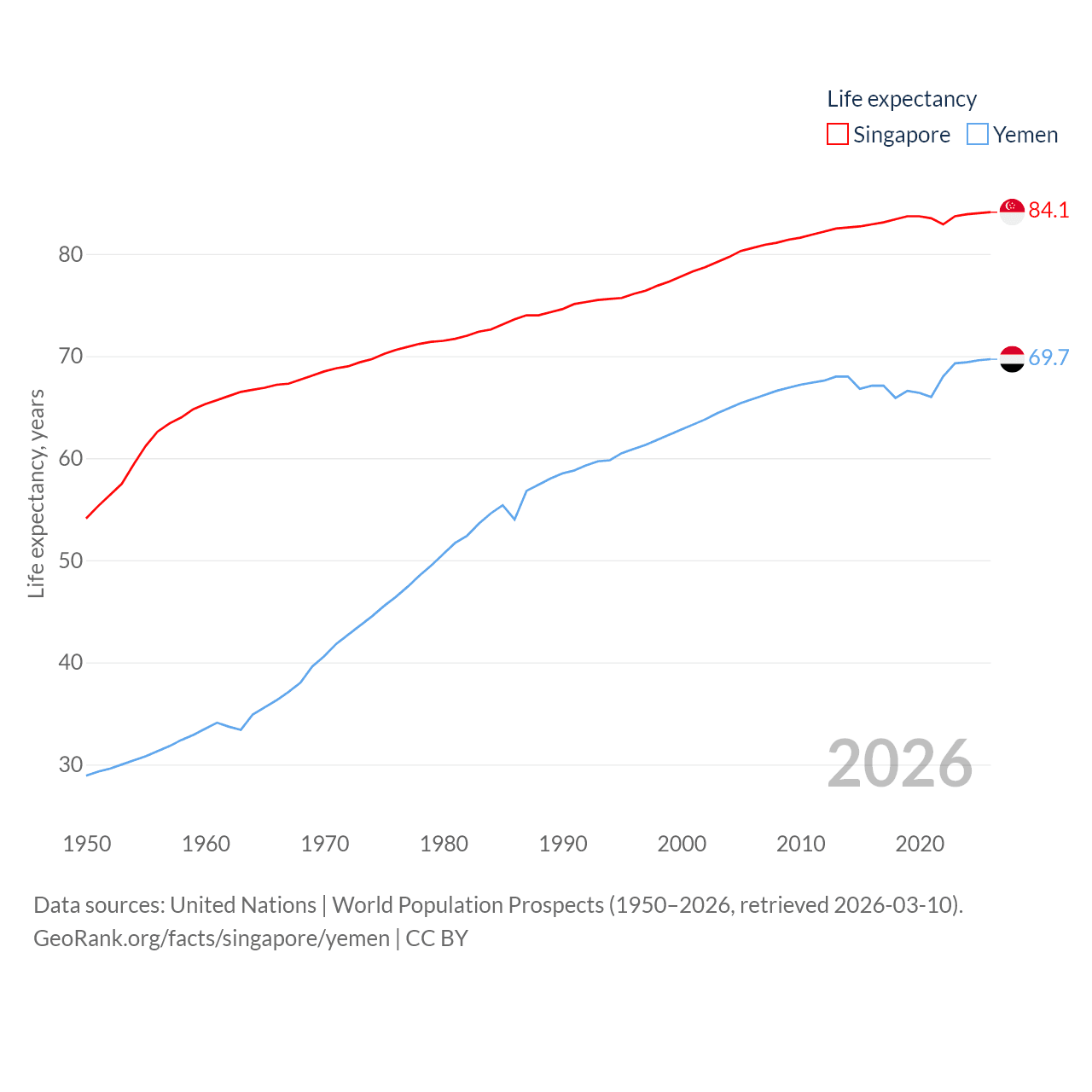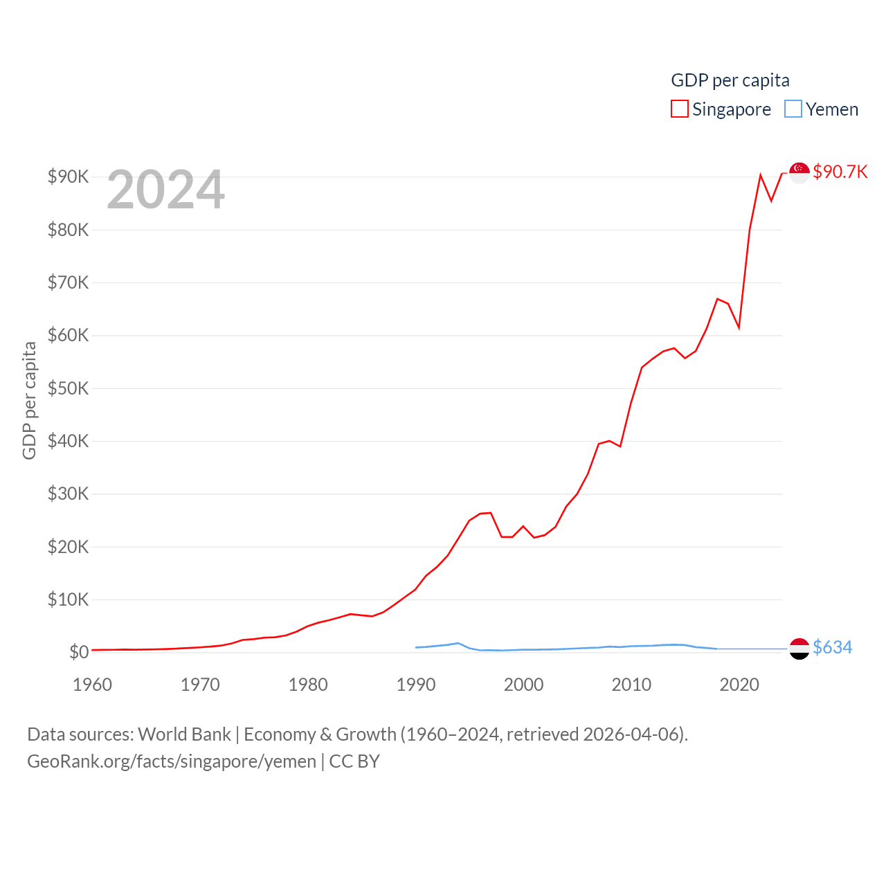 By GDP, Singapore ranks 28/197 ($547B) and Yemen ranks 125/197 ($21.6B). By GDP per capita, Singapore ranks 7/197 ($90,674), while Yemen ranks 191/197 ($634).