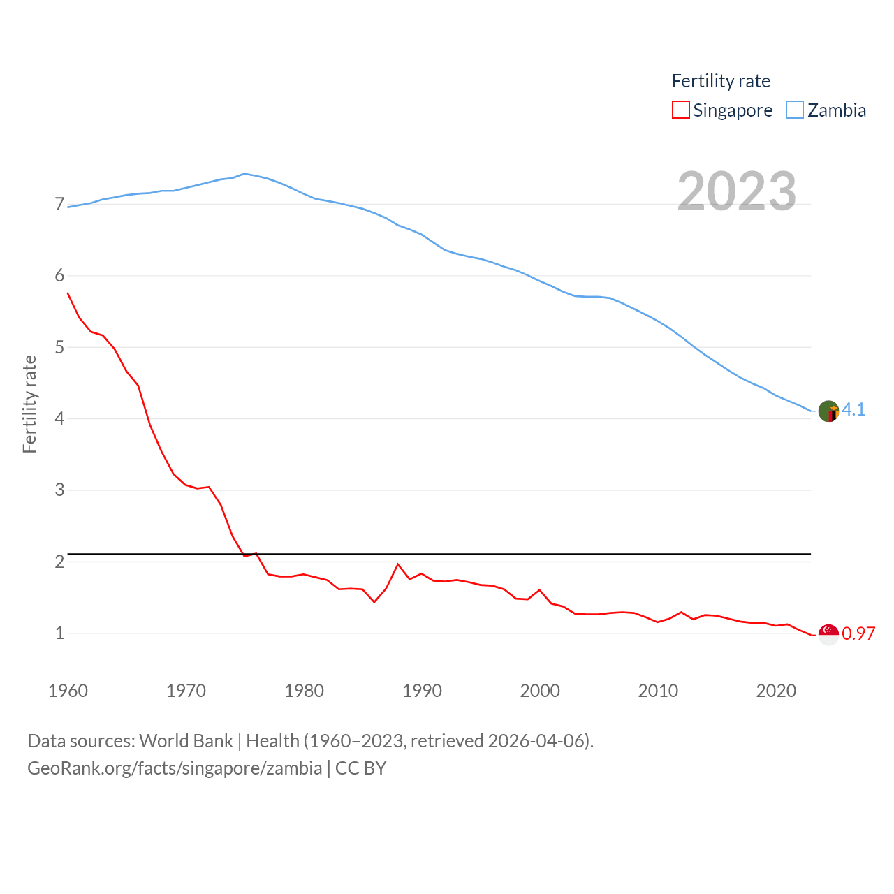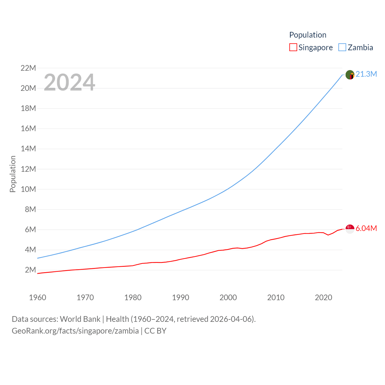 Singapore has a population of 6.04M (ranked 113/197), compared with 21.3M in Zambia (ranked 63/197). Singapore's land area is 277.2 sq mi versus 287,024 sq mi for Zambia (ranked 177th vs. 37th).