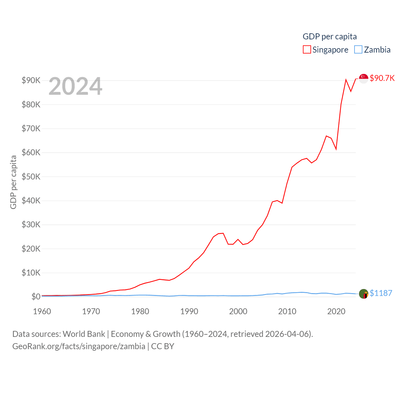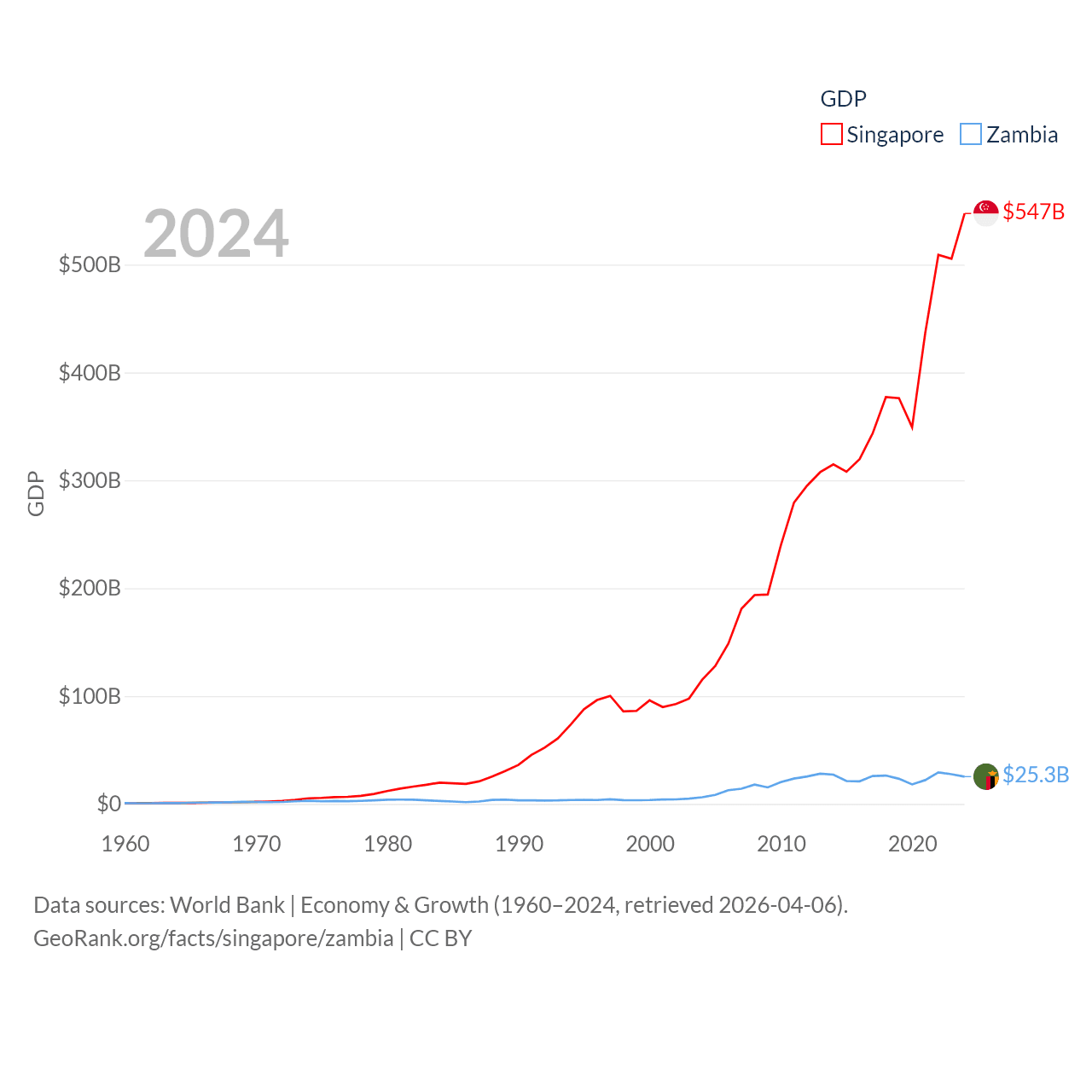 By GDP, Singapore ranks 28/197 ($547B) and Zambia ranks 116/197 ($25.3B). By GDP per capita, Singapore ranks 7/197 ($90,674), while Zambia ranks 169/197 ($1,187).