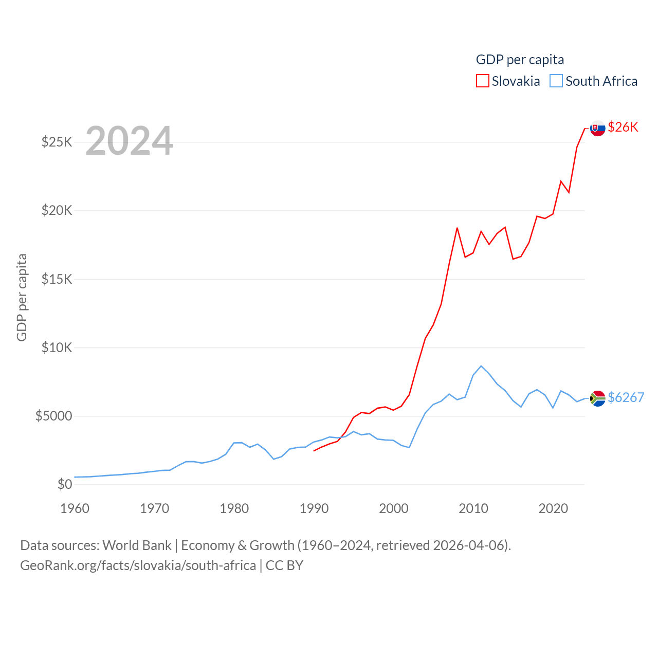 By GDP, Slovakia ranks 61/197 ($141B) and South Africa ranks 40/197 ($401B). By GDP per capita, Slovakia ranks 47/197 ($25,993), while South Africa ranks 111/197 ($6,267).