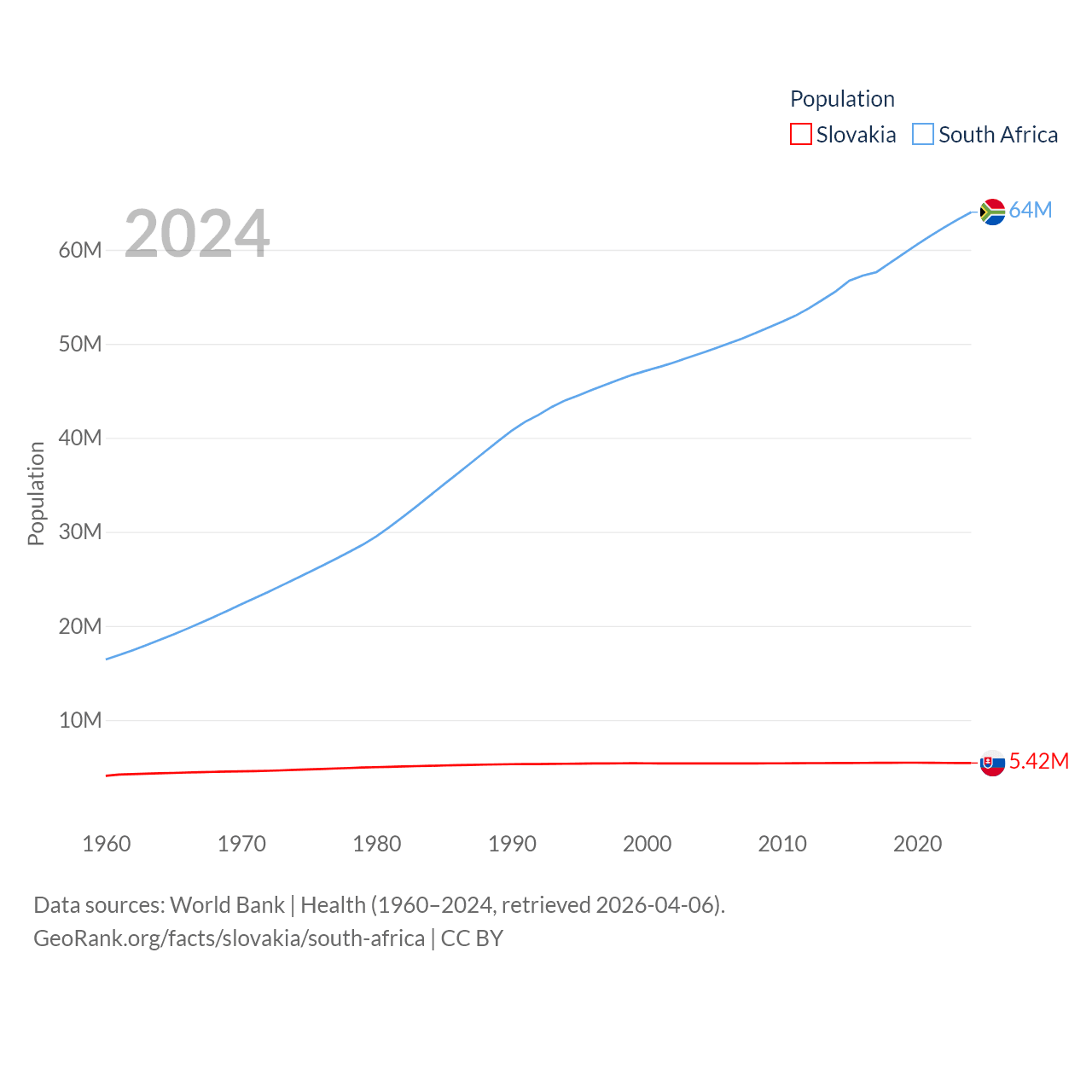 Slovakia has a population of 5.42M (ranked 119/197), compared with 64M in South Africa (ranked 24/197). Slovakia's land area is 18,564 sq mi versus 468,377 sq mi for South Africa (ranked 128th vs. 24th).