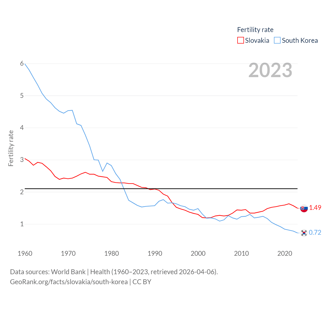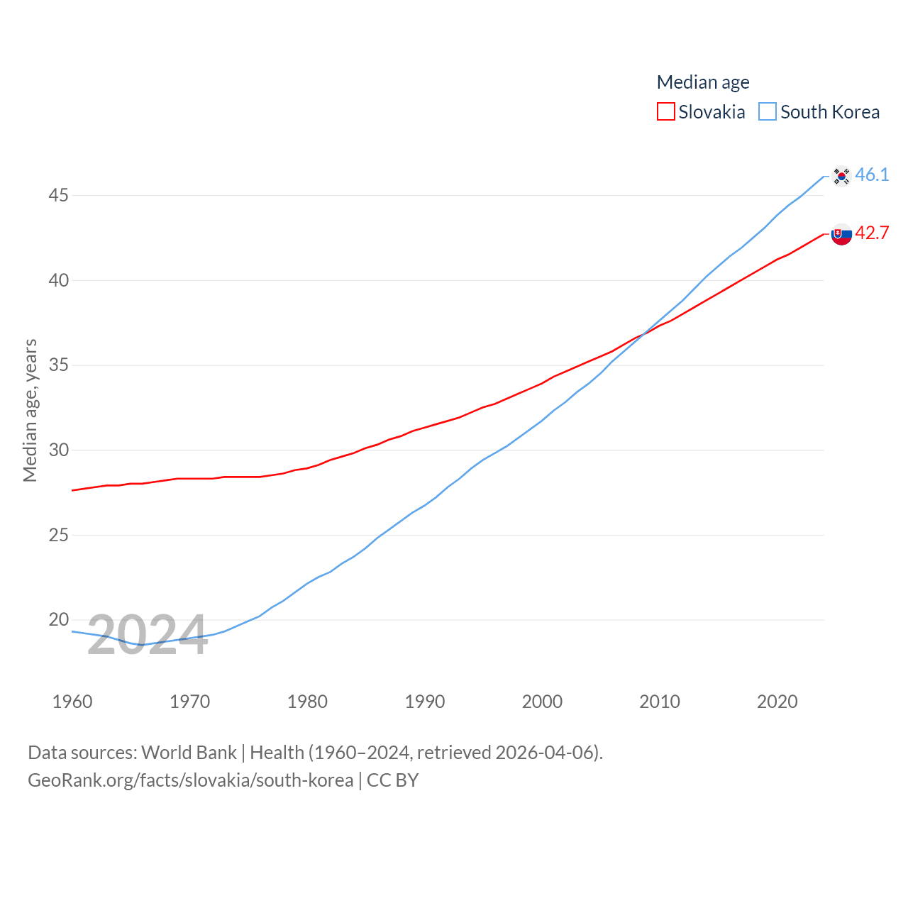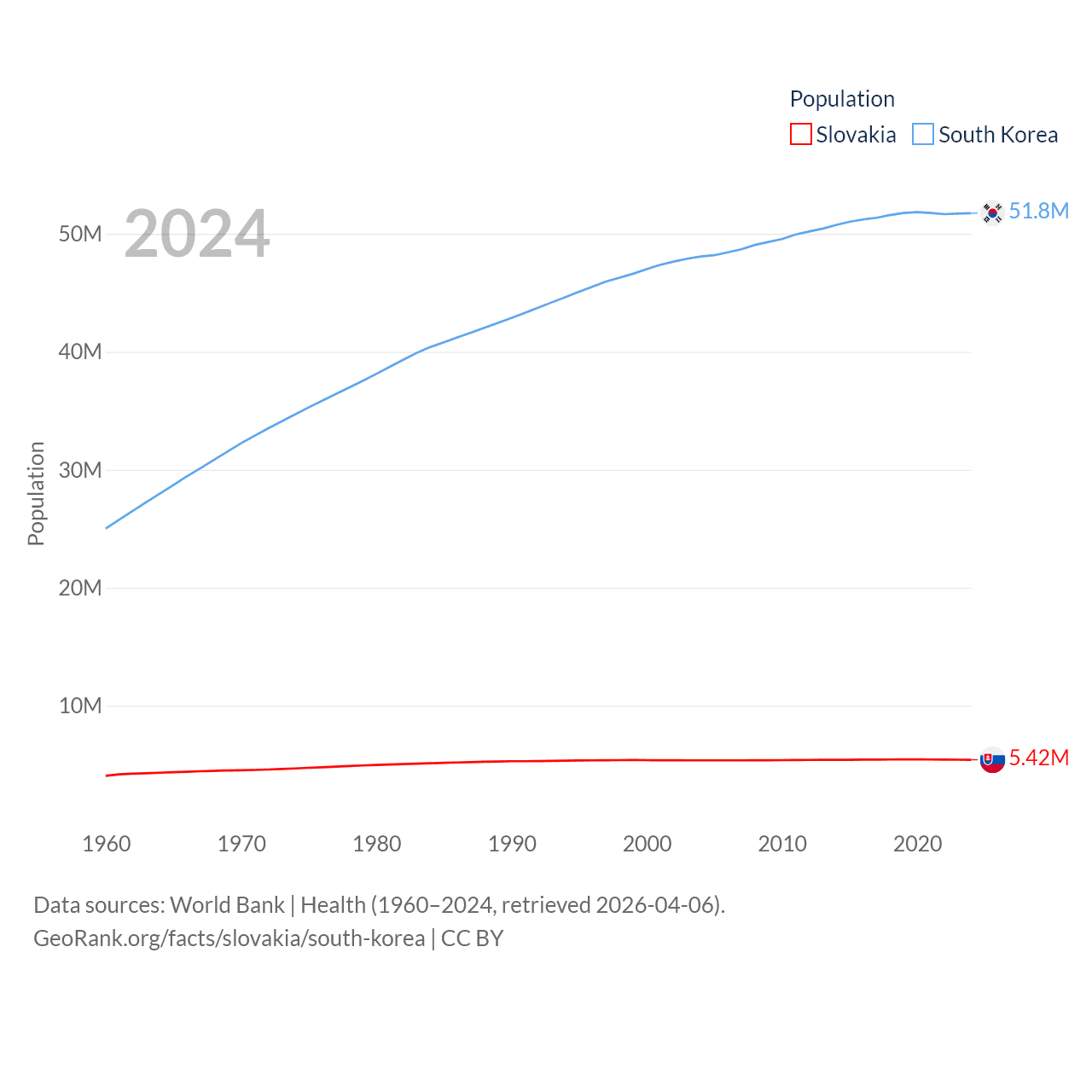 Slovakia has a population of 5.42M (ranked 119/197), compared with 51.8M in South Korea (ranked 29/197). Slovakia's land area is 18,564 sq mi versus 37,684 sq mi for South Korea (ranked 128th vs. 105th).