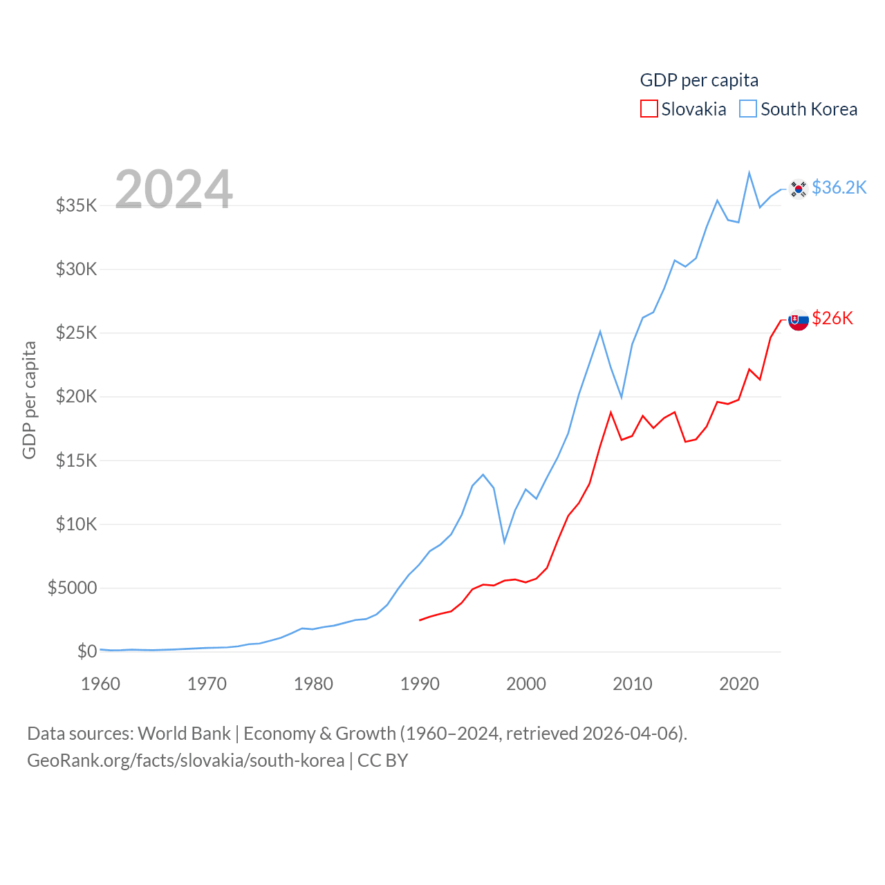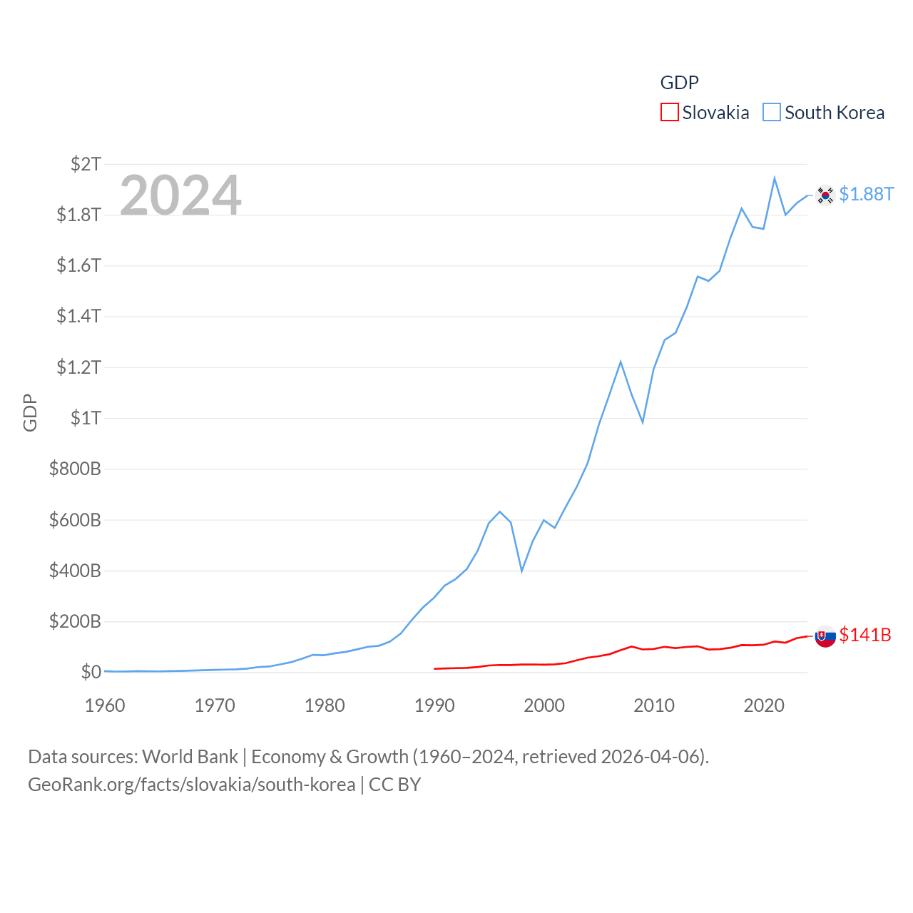 By GDP, Slovakia ranks 61/197 ($141B) and South Korea ranks 12/197 ($1.88T). By GDP per capita, Slovakia ranks 47/197 ($25,993), while South Korea ranks 31/197 ($36,239).