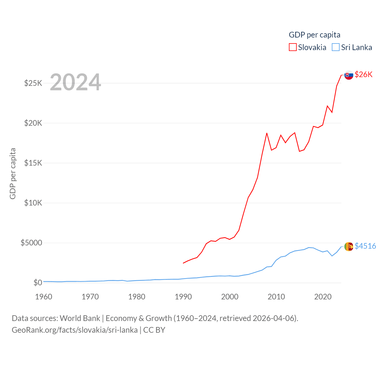 By GDP, Slovakia ranks 61/197 ($141B) and Sri Lanka ranks 72/197 ($99B). By GDP per capita, Slovakia ranks 47/197 ($25,993), while Sri Lanka ranks 124/197 ($4,516).