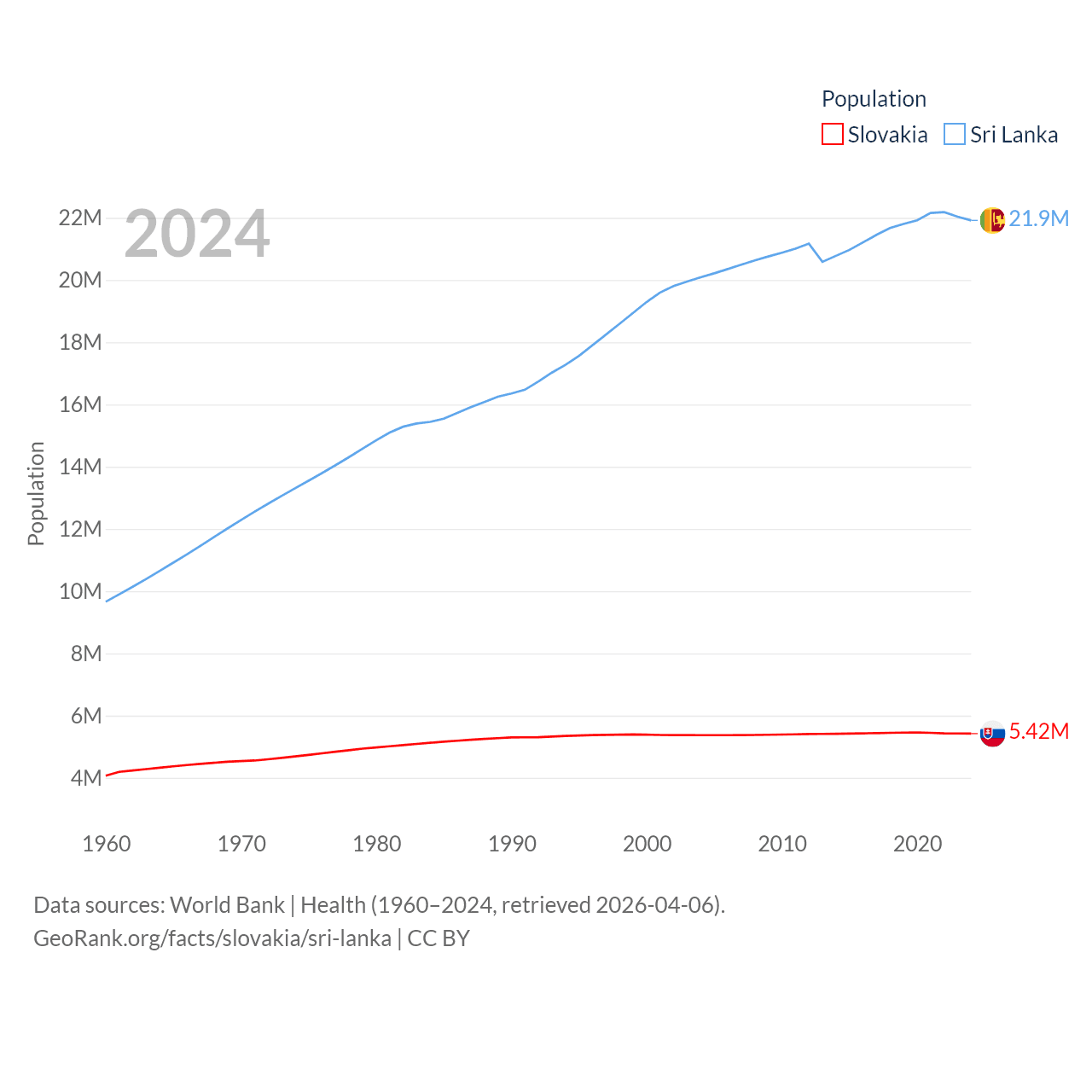 Slovakia has a population of 5.42M (ranked 119/197), compared with 21.9M in Sri Lanka (ranked 61/197). Slovakia's land area is 18,564 sq mi versus 23,884 sq mi for Sri Lanka (ranked 128th vs. 122nd).
