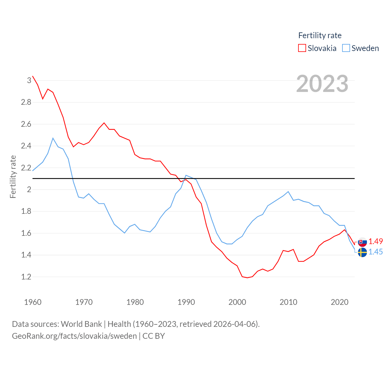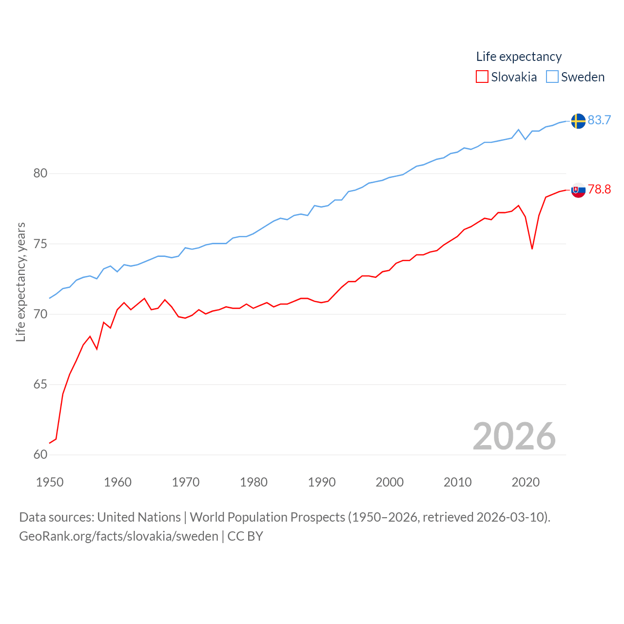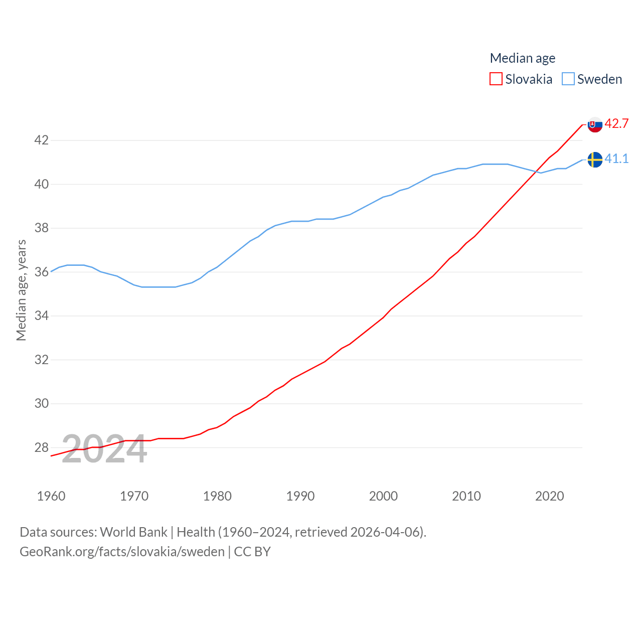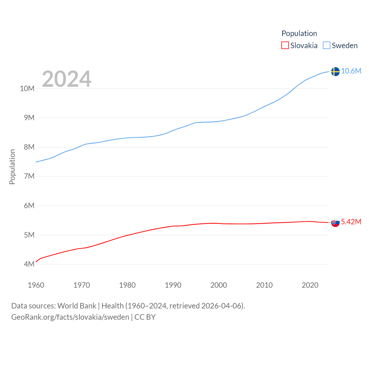 Slovakia has a population of 5.42M (ranked 119/197), compared with 10.6M in Sweden (ranked 93/197). Slovakia's land area is 18,564 sq mi versus 157,248 sq mi for Sweden (ranked 128th vs. 58th).