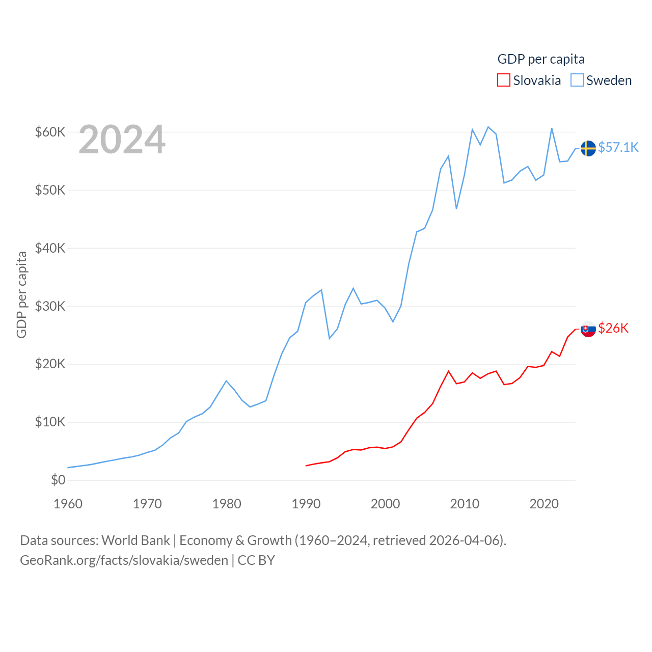 By GDP, Slovakia ranks 61/197 ($141B) and Sweden ranks 26/197 ($604B). By GDP per capita, Slovakia ranks 47/197 ($25,993), while Sweden ranks 17/197 ($57,117).