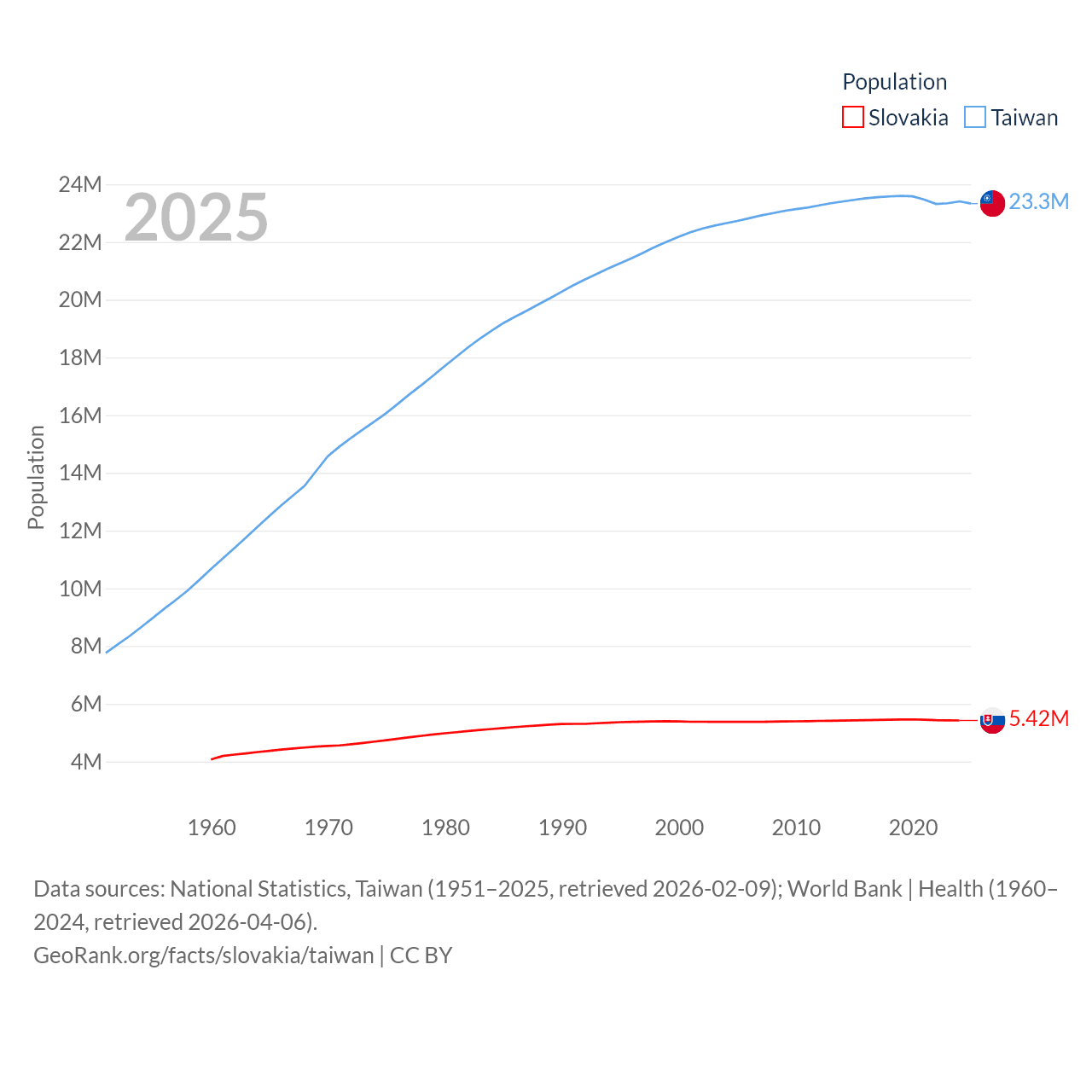 Slovakia has a population of 5.42M (ranked 119/197), compared with 23.3M in Taiwan (ranked 60/197). Slovakia's land area is 18,564 sq mi versus 13,976 sq mi for Taiwan (ranked 128th vs. 133rd).