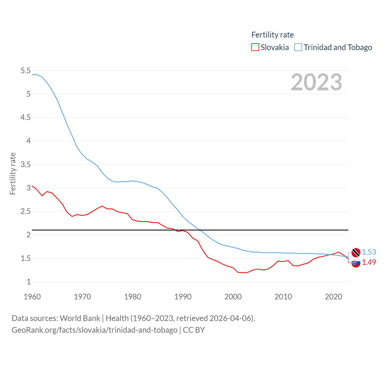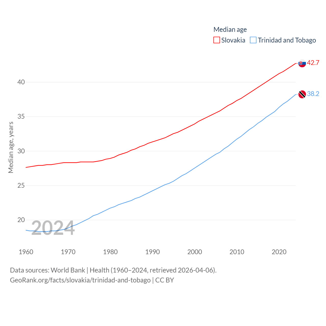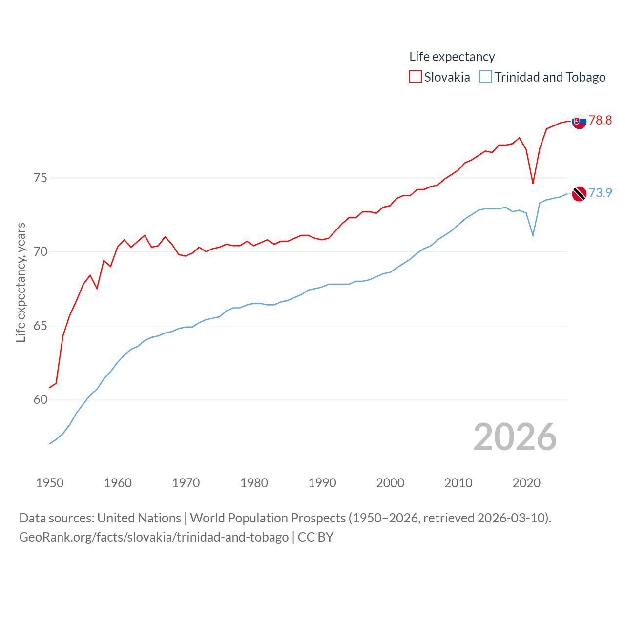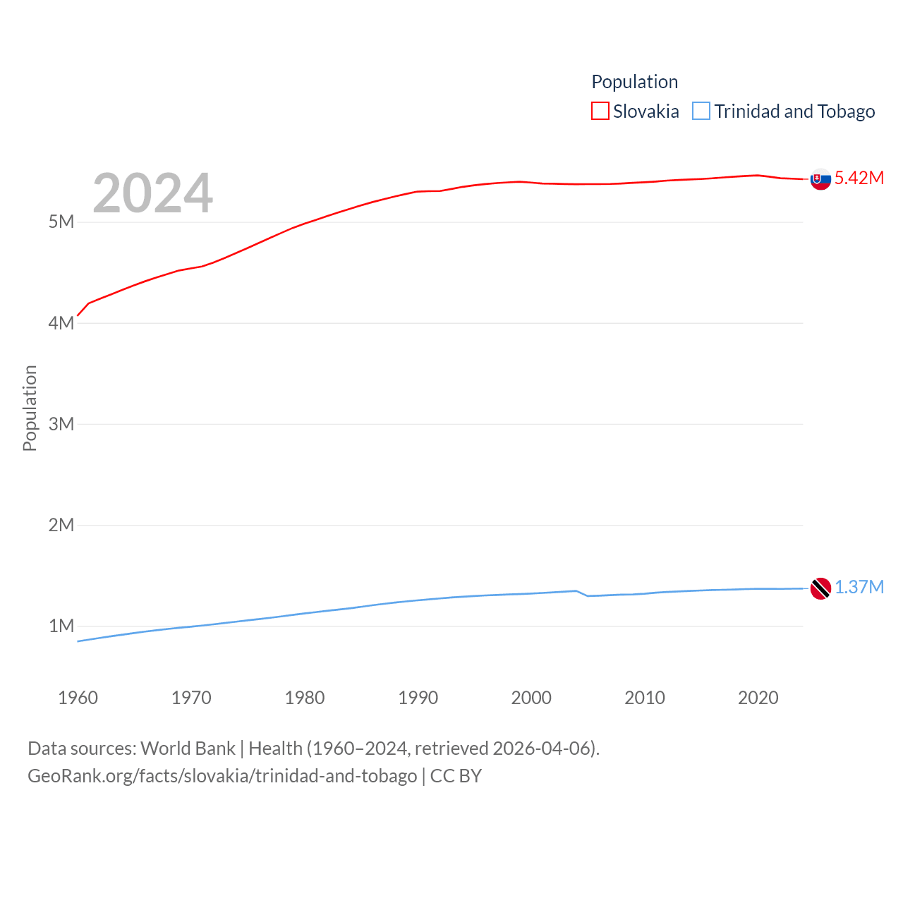 Slovakia has a population of 5.42M (ranked 119/197), compared with 1.37M in Trinidad and Tobago (ranked 154/197). Slovakia's land area is 18,564 sq mi versus 1,981 sq mi for Trinidad and Tobago (ranked 128th vs. 166th).