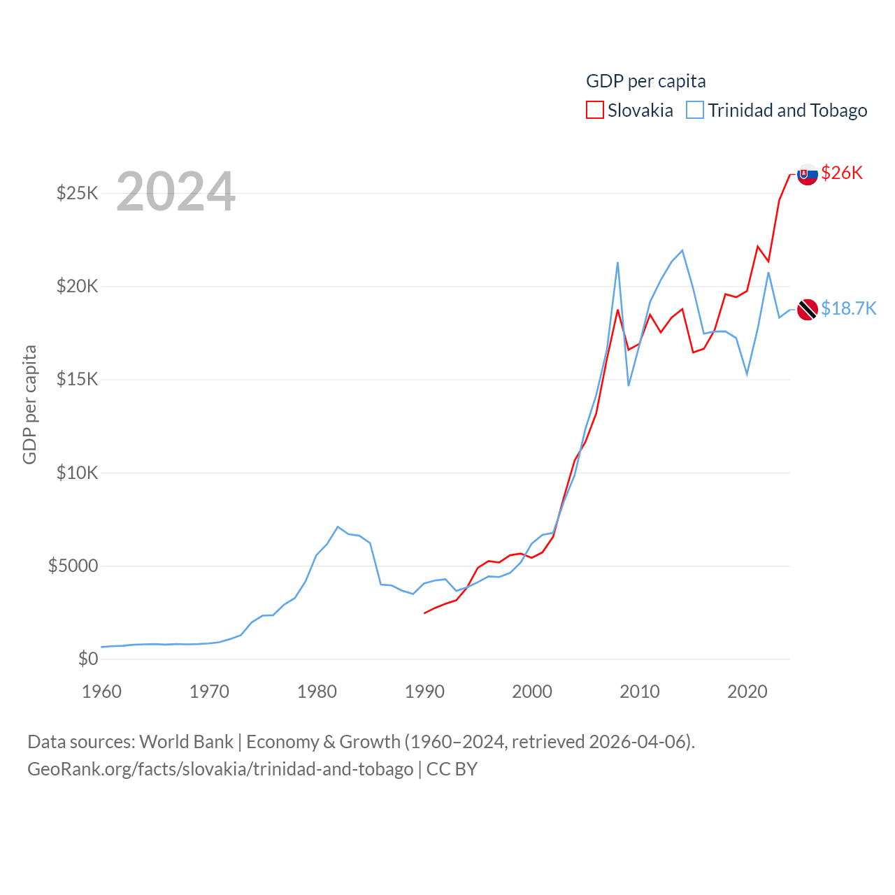 By GDP, Slovakia ranks 61/197 ($141B) and Trinidad and Tobago ranks 115/197 ($25.6B). By GDP per capita, Slovakia ranks 47/197 ($25,993), while Trinidad and Tobago ranks 61/197 ($18,733).