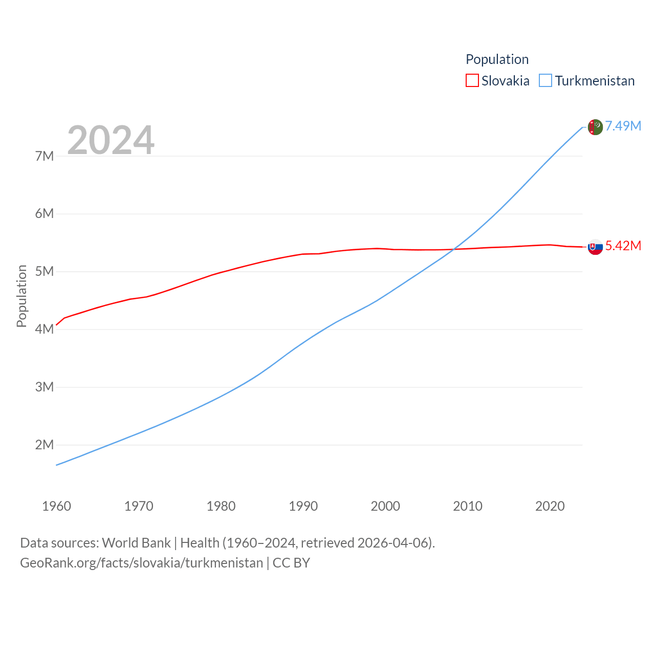 Slovakia has a population of 5.42M (ranked 119/197), compared with 7.49M in Turkmenistan (ranked 104/197). Slovakia's land area is 18,564 sq mi versus 181,441 sq mi for Turkmenistan (ranked 128th vs. 53rd).