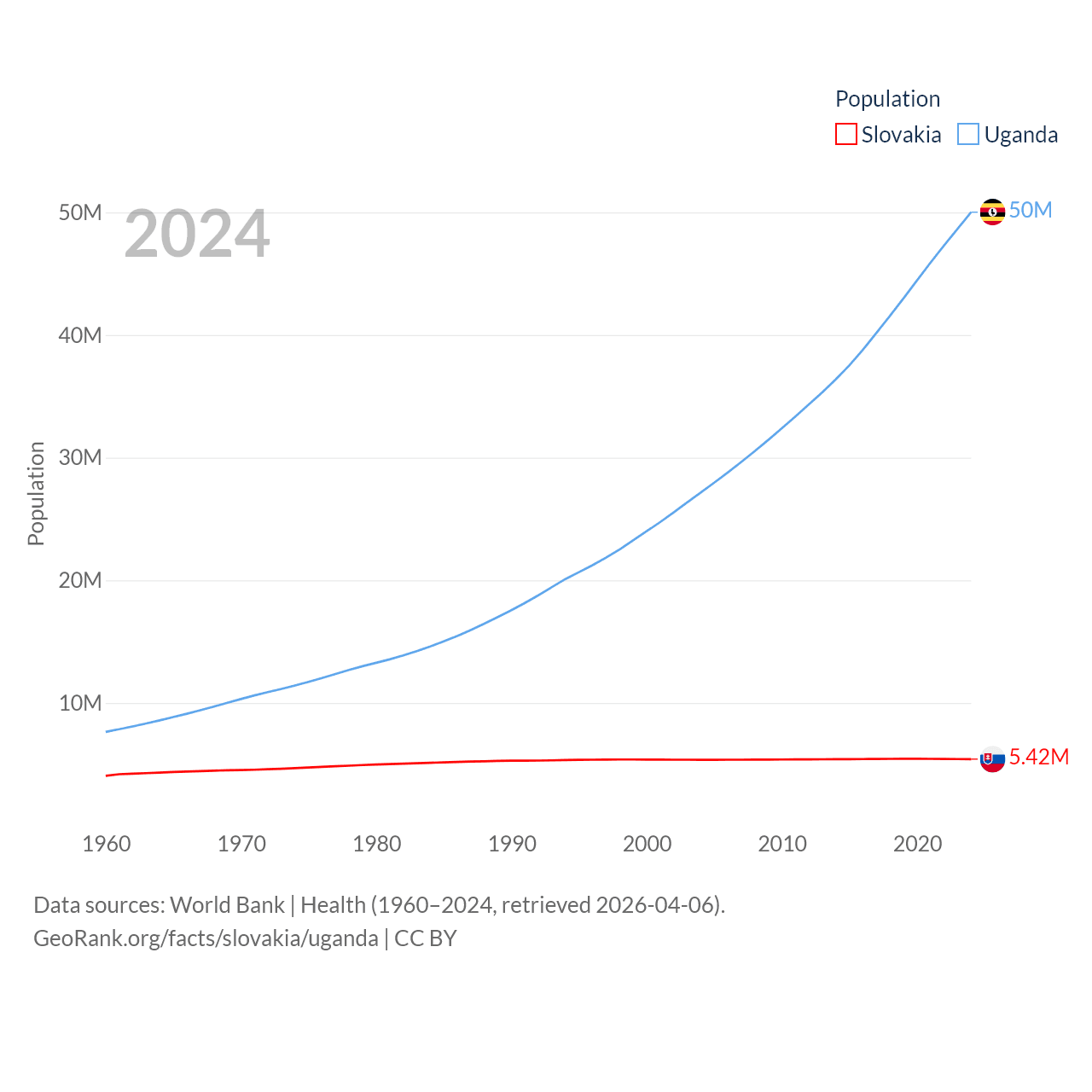 Slovakia has a population of 5.42M (ranked 119/197), compared with 50M in Uganda (ranked 31/197). Slovakia's land area is 18,564 sq mi versus 77,421 sq mi for Uganda (ranked 128th vs. 84th).