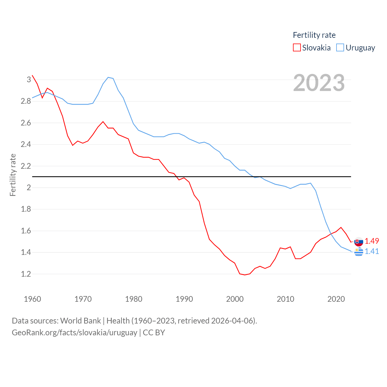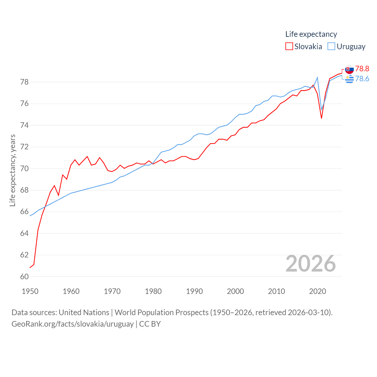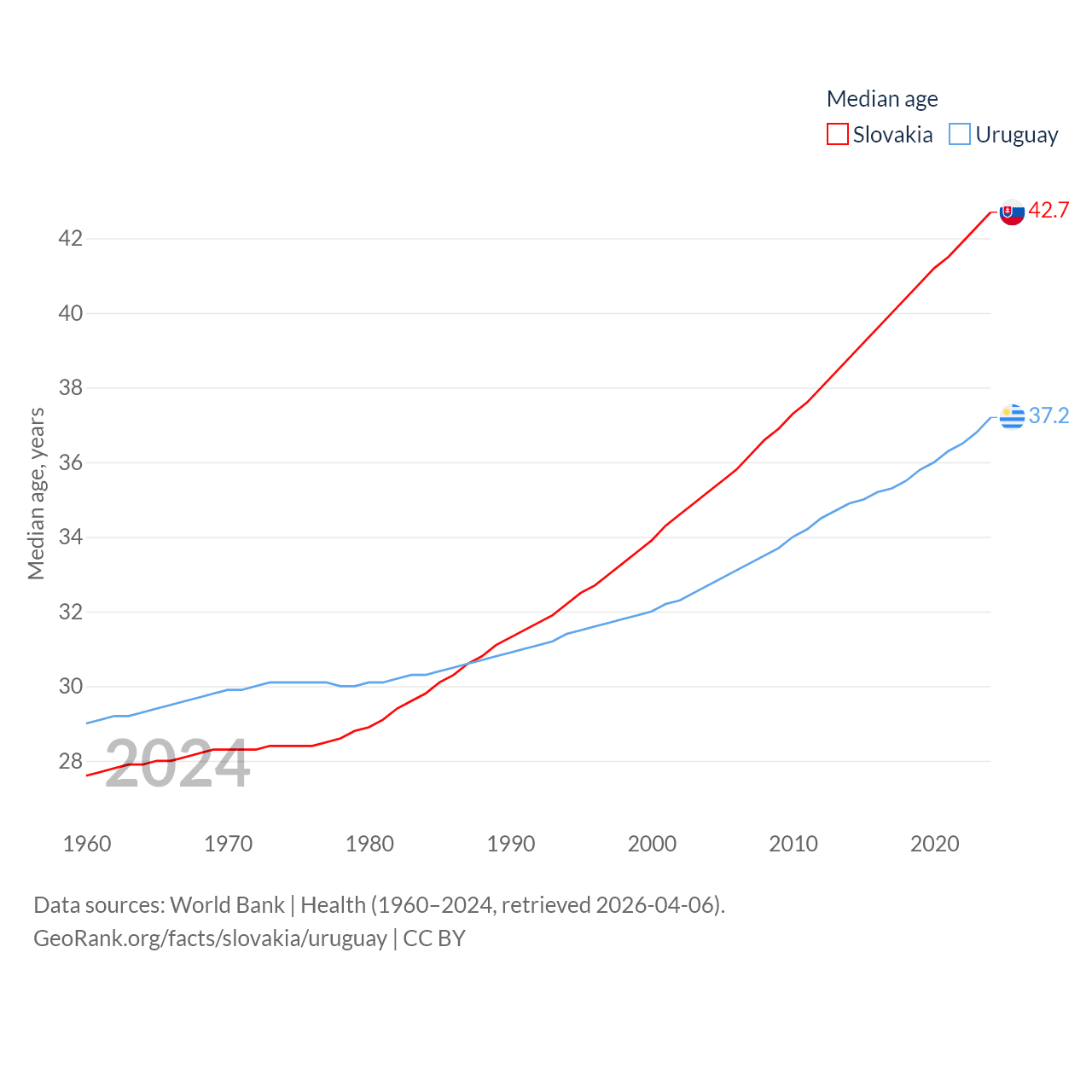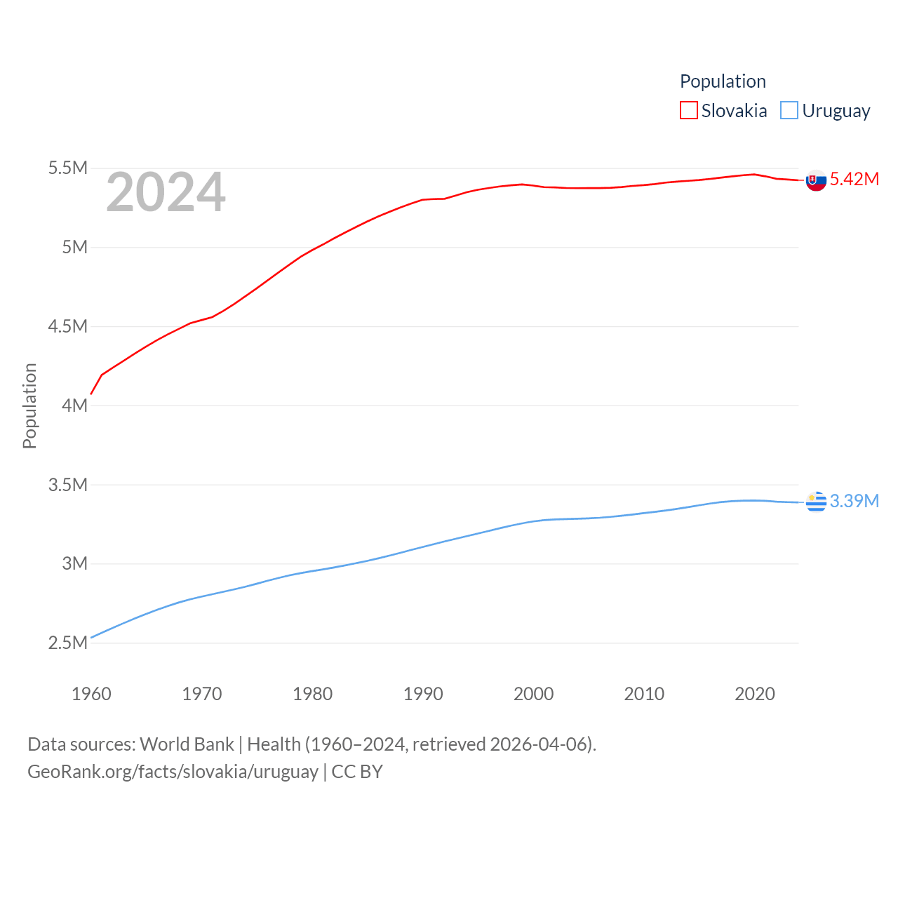 Slovakia has a population of 5.42M (ranked 119/197), compared with 3.39M in Uruguay (ranked 133/197). Slovakia's land area is 18,564 sq mi versus 67,576 sq mi for Uruguay (ranked 128th vs. 89th).