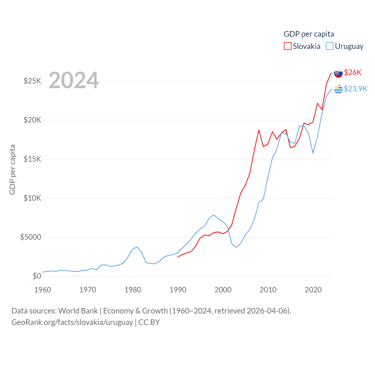 By GDP, Slovakia ranks 61/197 ($141B) and Uruguay ranks 81/197 ($81B). By GDP per capita, Slovakia ranks 47/197 ($25,993), while Uruguay ranks 52/197 ($23,907).